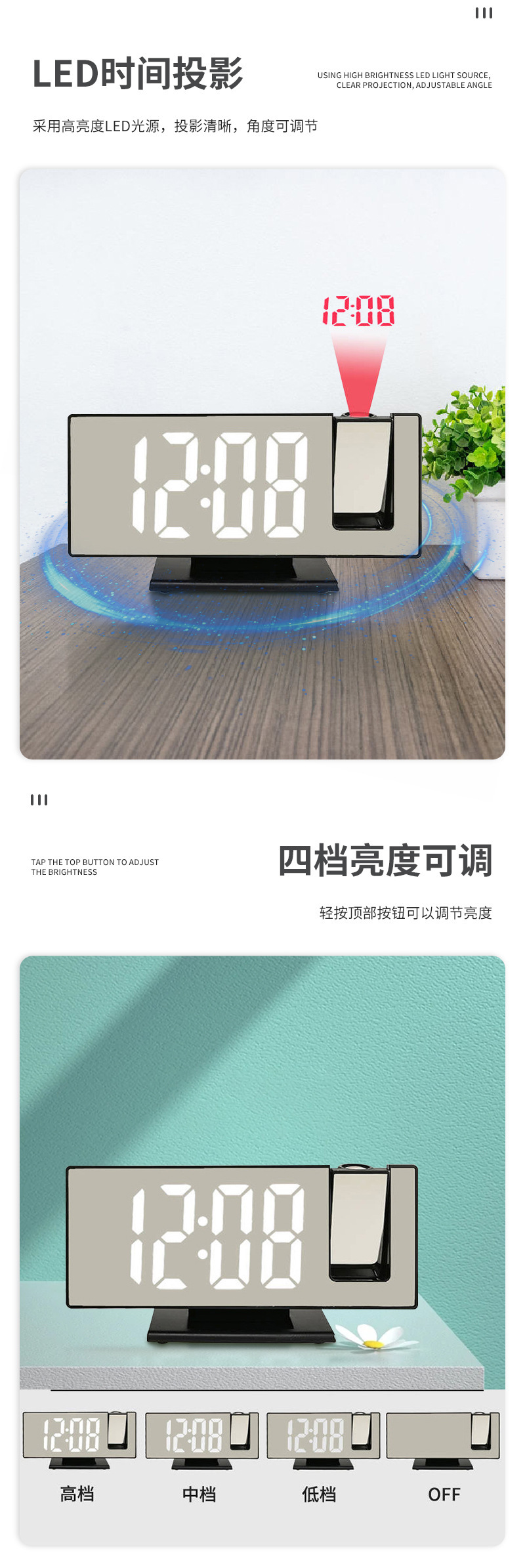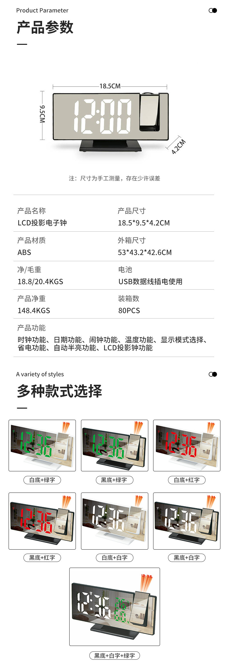 新款LED投影时钟 多功能数字闹钟 自动感光电子时钟带USB插电跨境