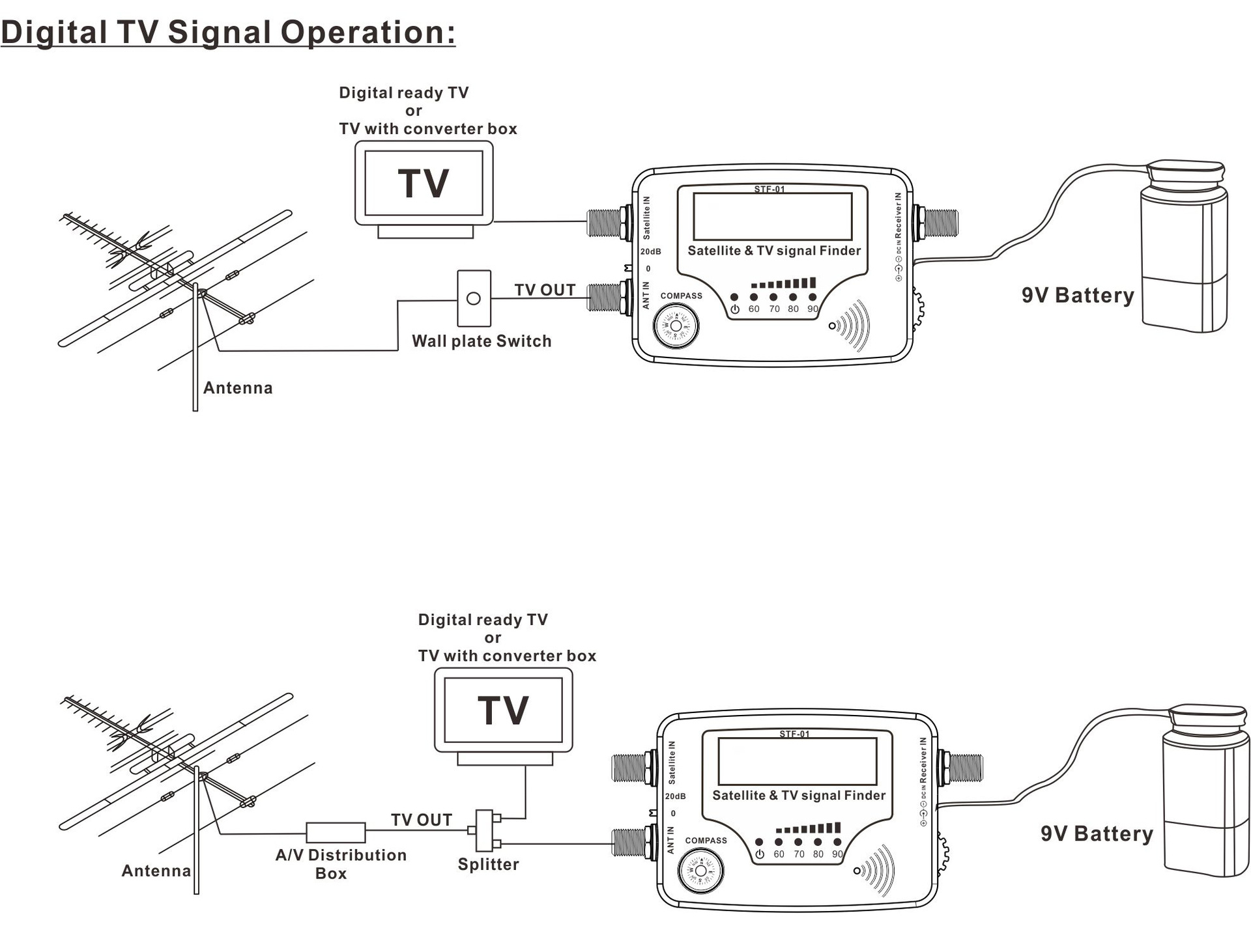 1. 将寻星仪一侧标有“Satellite”连接到天线高频头处,将另一侧标有“Receiver”端口连接到接收机上,并将接收机和电视机打开。