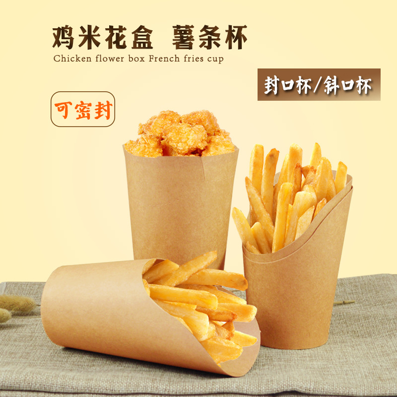 使い捨てのクラフト紙のポテトチップスの紙コップの斜めの口のコップの封口の杯の鶏の足のフライドチキンの包装の桶のポテトチップスの箱の鶏肉の花の杯