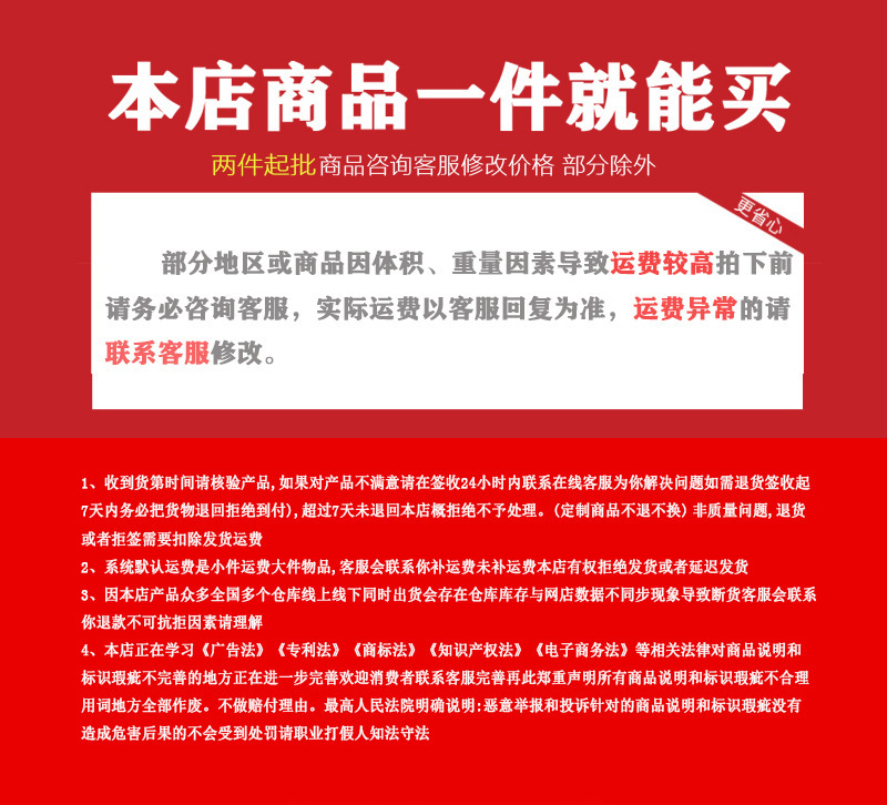 亲,本店铺宝贝图片上的活动价格已结束了哦,具体价格以提交订单为准!关于图片:本店如果在上货期间不小心用了亲的图片,请亲第一时间通知!店铺不易,接到通知会第一时间删除!万分感谢!由于本公司产品种类丰富,难免会出现库存更新不及时的情况,麻烦拍下前咨询一下客服是否有货,偏远地区需要补邮费,具体邮费请咨询在线客服!自行拍下的亲,如果遇到库存问题本店有权不发货,不便之处敬请见谅!