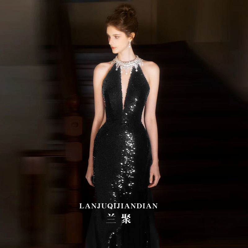 ブラックイブニングドレス 2025 新しい成人式ハイエンドニッチブライダルフィッシュテール婚約ドレススパンコールライトラグジュアリー