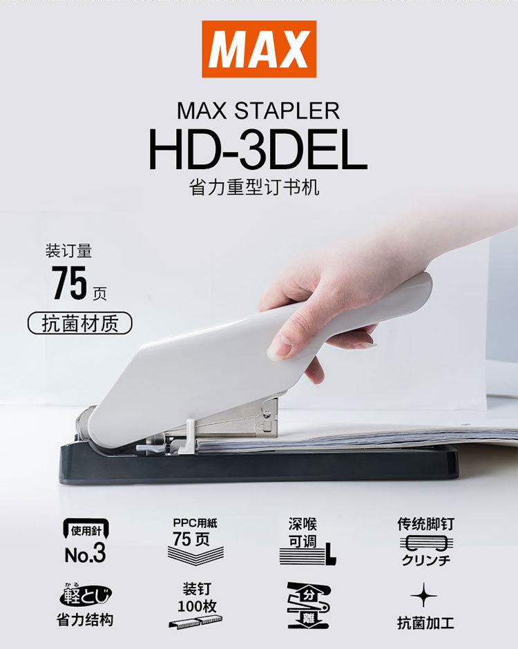 日本max米克司輸入HD-3DEL重型ホッチキスのダブルレバーの省力ホッチキスは2-75ページ注文できます。