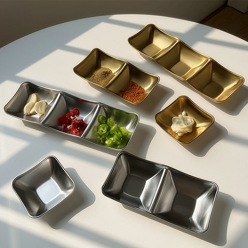 304ステンレスの味皿の金色の韓国式の調味料の皿の鍋の調味料の皿の調味料の皿の焼肉の食器の2格の3格