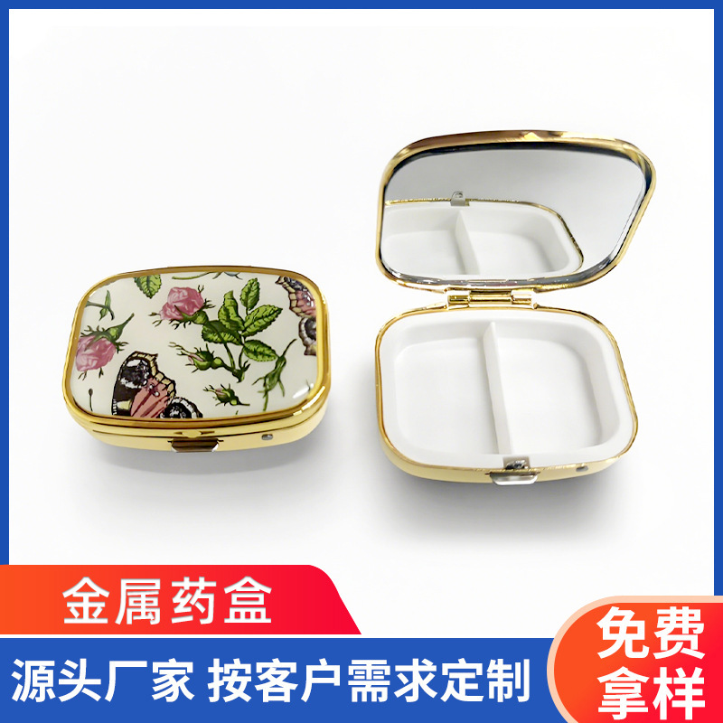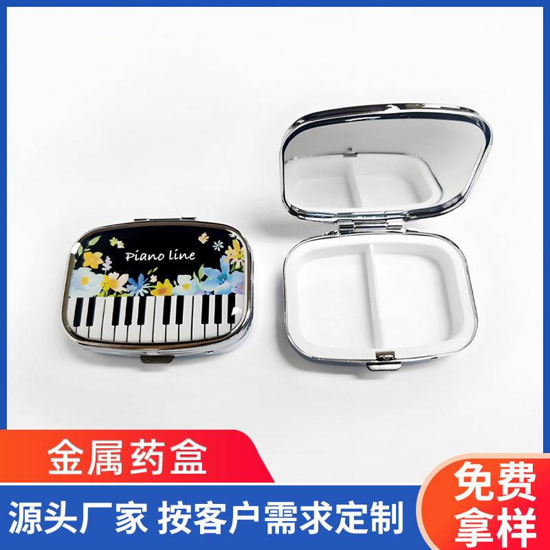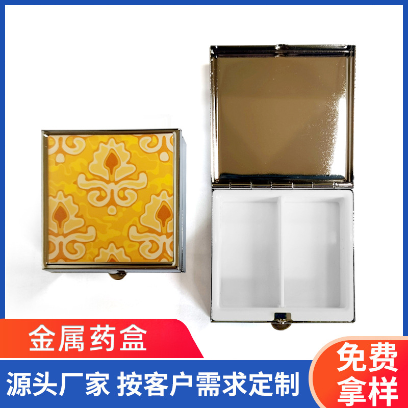 メーカー卸売 正方形薬箱 ロゴ入り 金属製ピルケース 小さなジュエリーボックス 2つのコンパートメント付き金属製小型薬箱