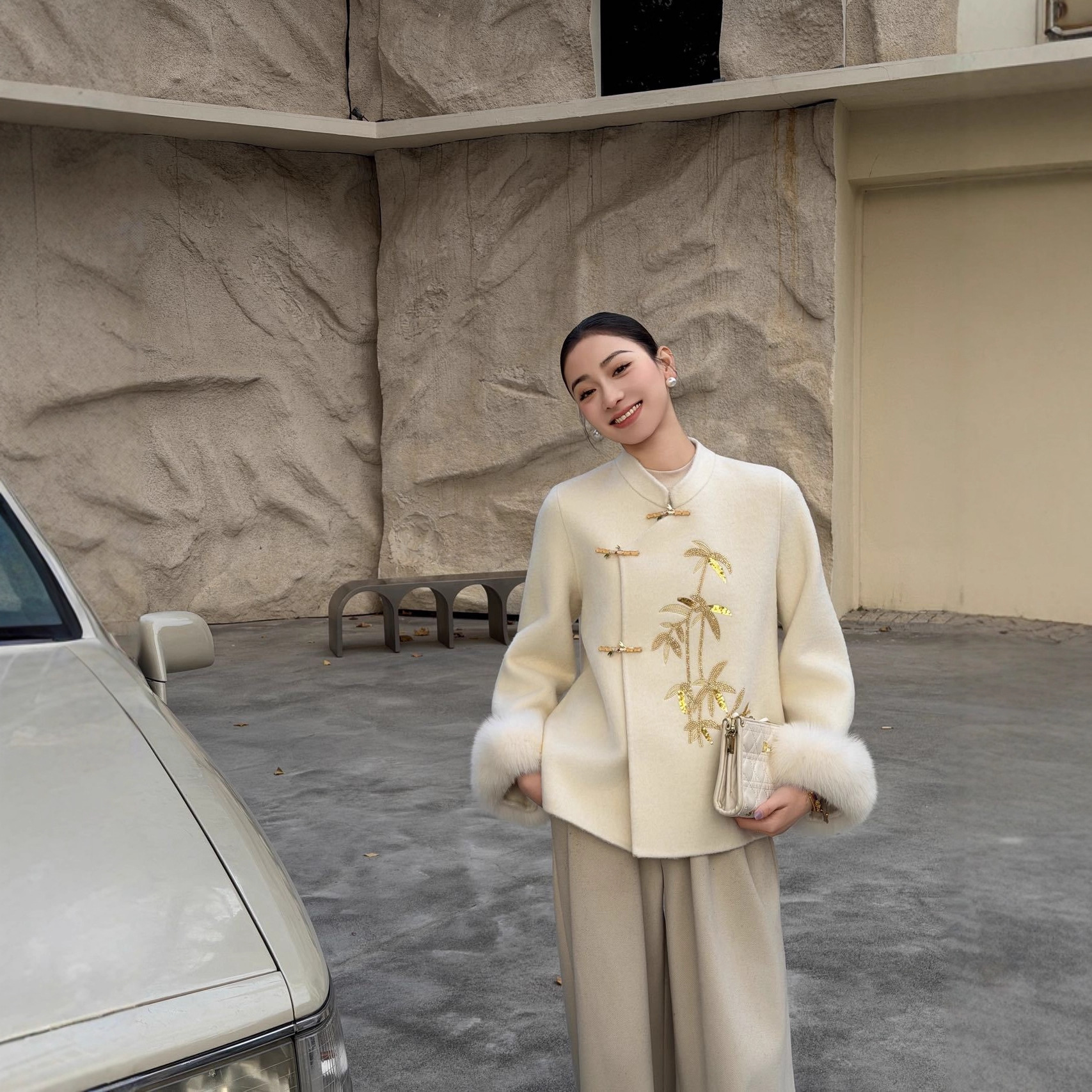 2025秋冬新款中式国风贴钻重工女秋冬季立领保暖毛呢外套