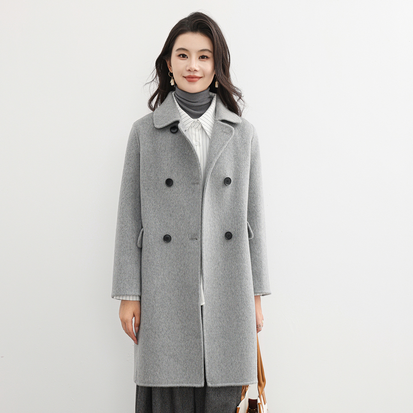 冬季中长款双面绵羊绒大衣女双排扣正肩宽松翻领羊毛呢子风衣外套