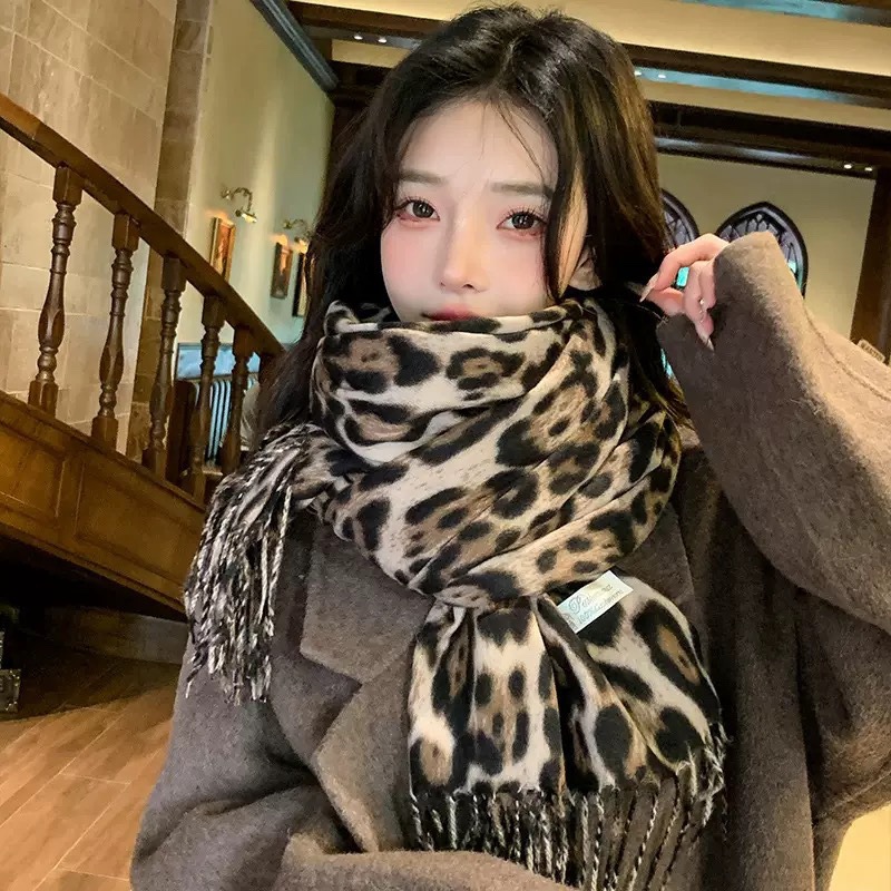 秋冬季围巾女高级感复古豹纹流苏学院辣妹风百搭加厚披肩保暖围脖