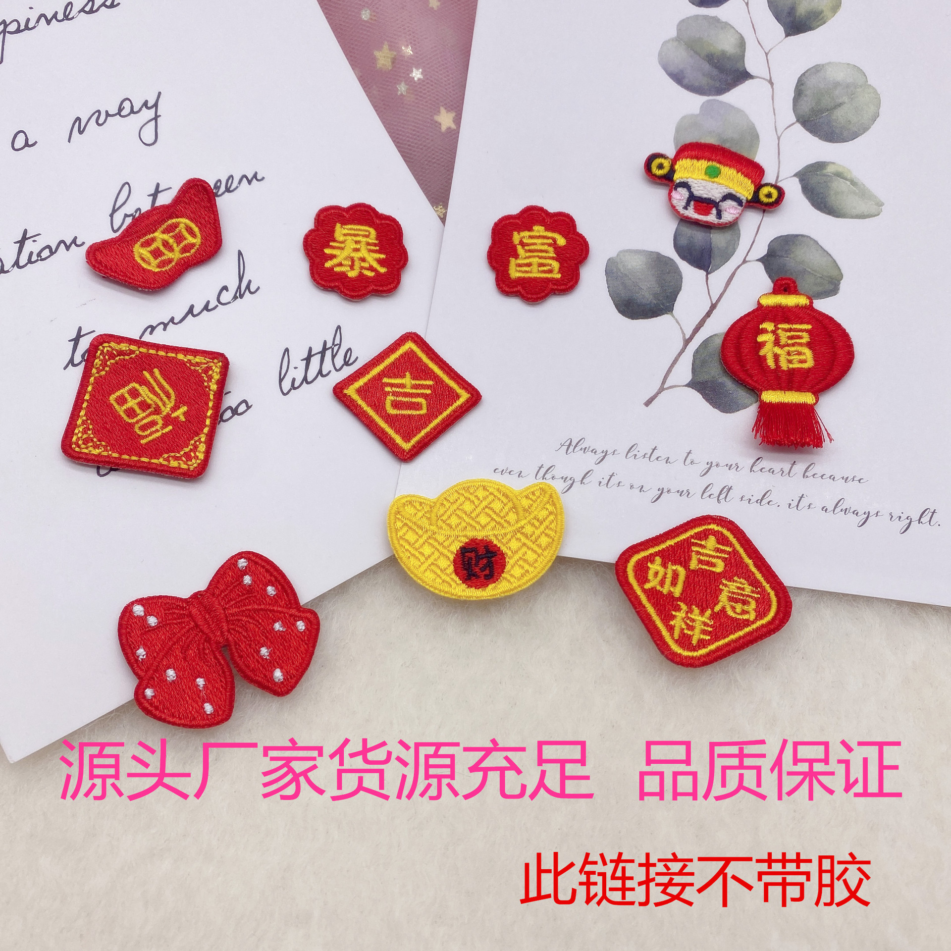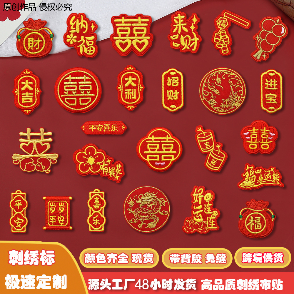 新年中国风刺绣布贴自粘红色喜庆国潮补丁贴服装箱包装饰布贴批发