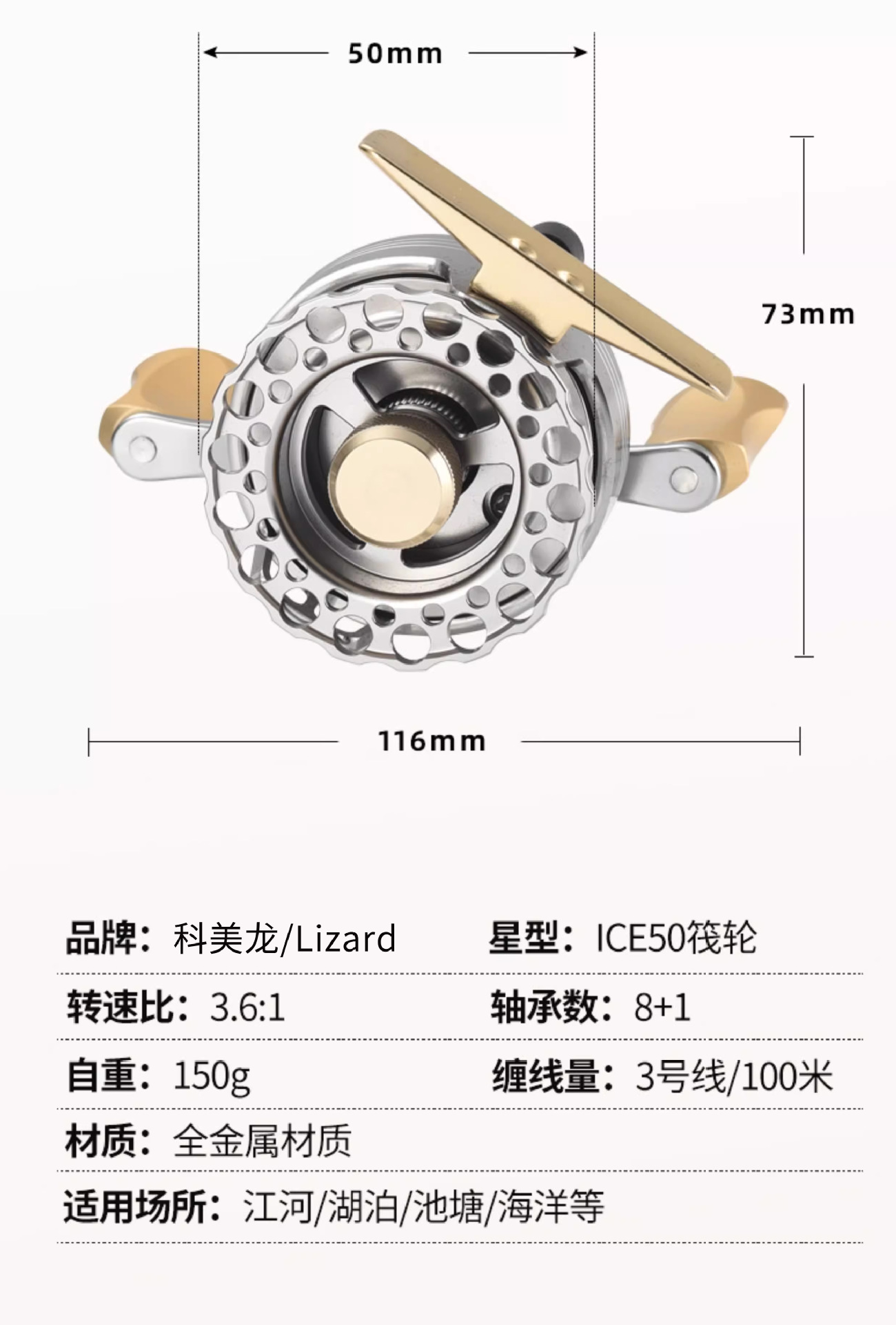 科美龙アイスフィッシング用ラフフィッシングリール、オールメタルICE50リリース力マイクロリードブリッジラフ、ステンレス製海水対応ラフリール