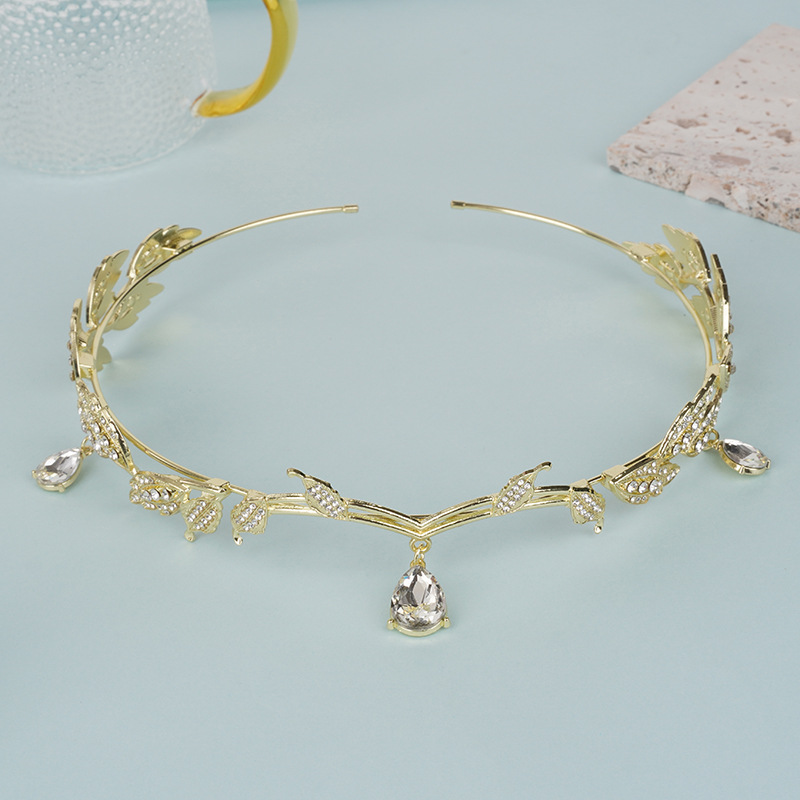 跨境树叶水滴发箍皇冠满钻新娘额饰定制超仙公主头饰金色头箍配饰
