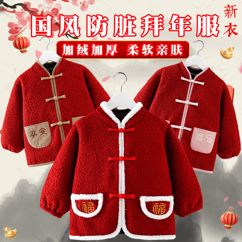 新年宝宝罩衣国风款加绒拜年服婴儿洋气长袖围兜防脏冬季吃饭护衣