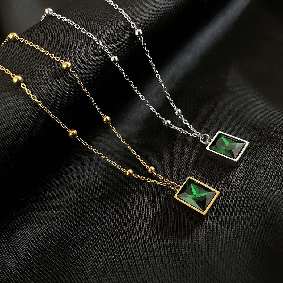 チタン鋼の四角の緑の宝石の極めて簡単な風の祖母の緑のペンダントのネックレスの玉の鎖の幾何学の鎖の骨の鎖の軽い贅沢な気質の女性