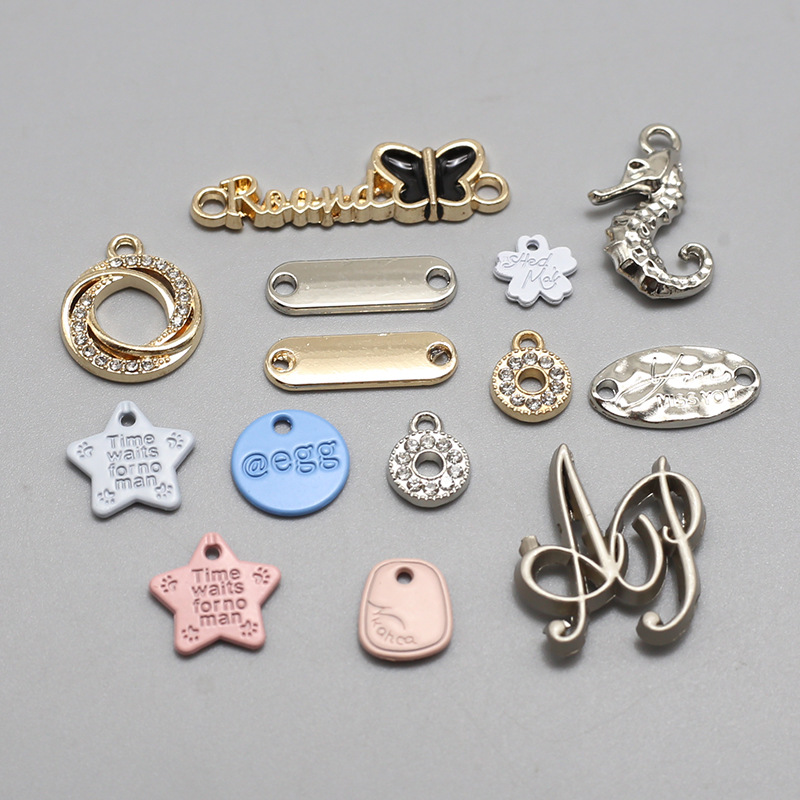 穴あき金属製ロゴ、手縫い文字ロゴ、インナーウェア、衣類、吊り下げチェーン、トレンドブランド、バッグ、金属ロゴ