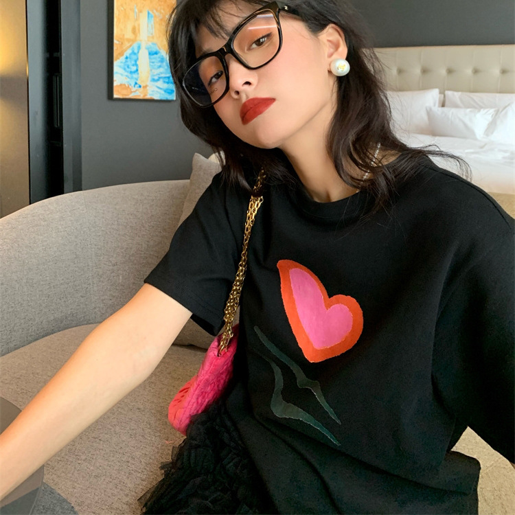 2025春夏新作 純綿半袖Tシャツ レディース インス風 韓国風 東大門風 ゆったり 大きめサイズ 黒色半袖トップス