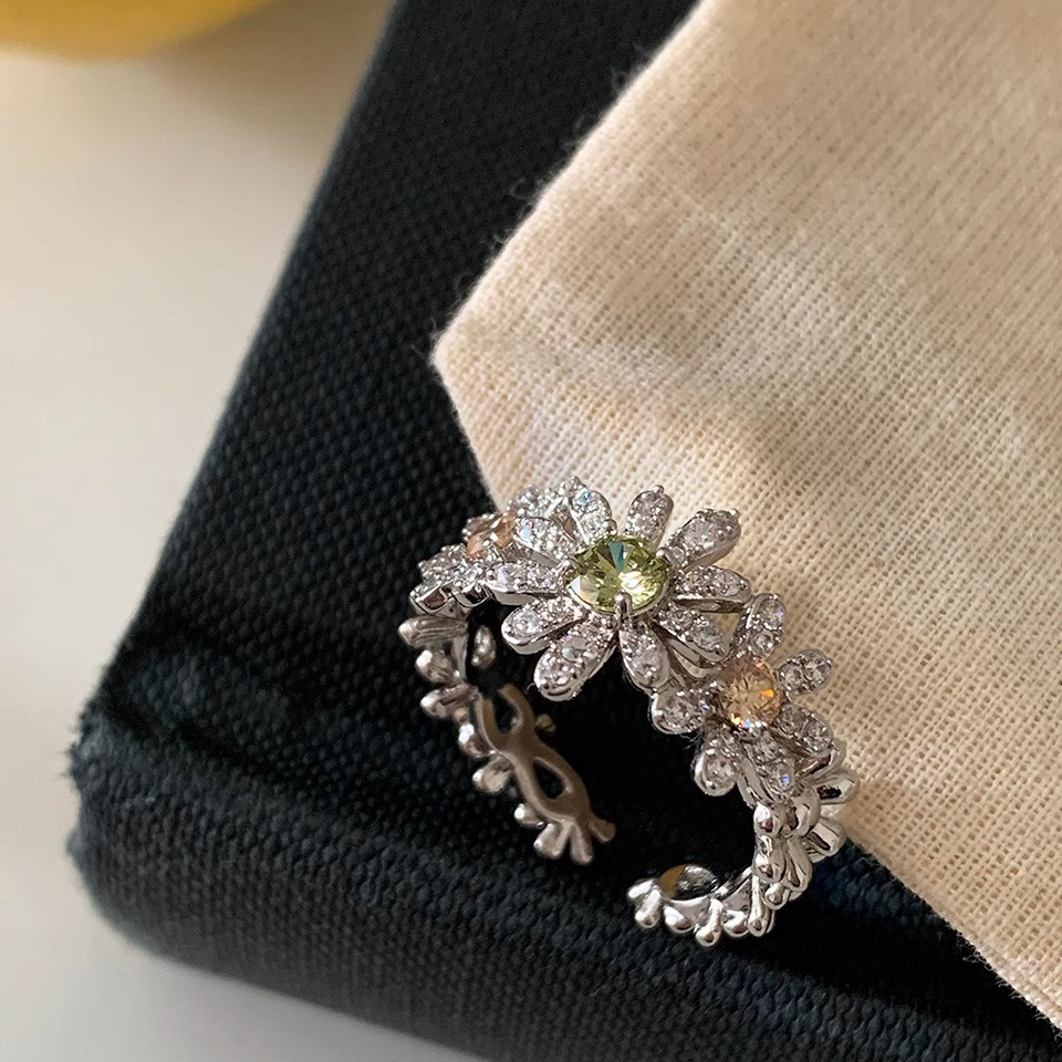 爆発的な光!ライトラグジュアリーフルダイヤモンドデイジーリングレディースニッチハイエンド人差し指リング新しいハンドジュエリーオープンリング