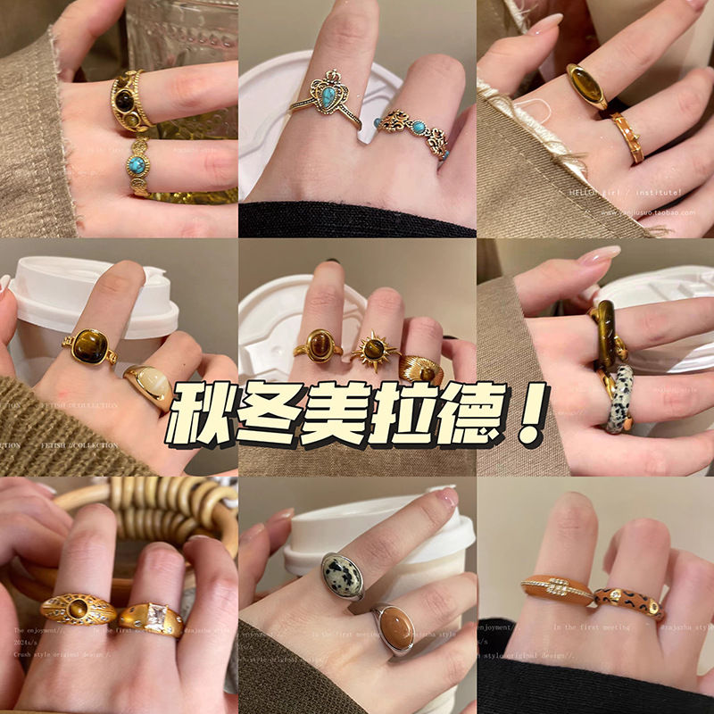 琥珀流光仿虎眼石闪钻戒指女秋季新款美拉德轻奢高级感食指开口戒