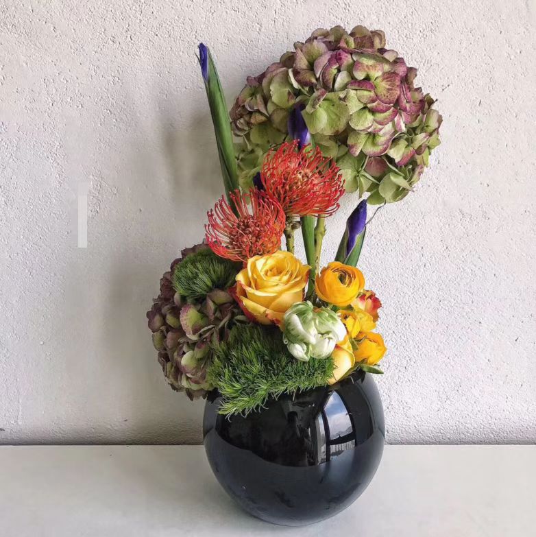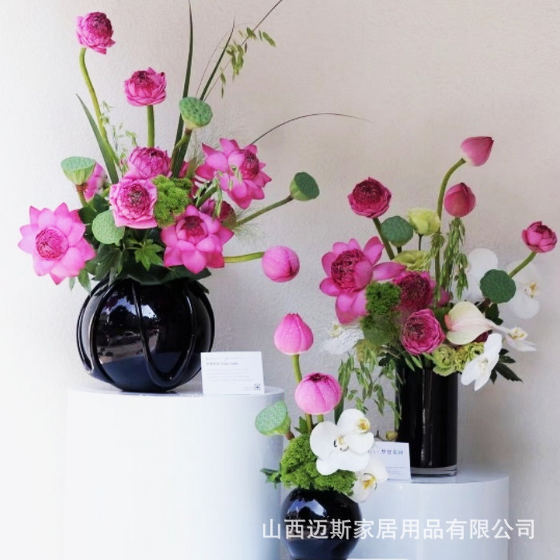 モダンシンプルな黒い丸い球形のガラス花瓶ホテルのロビーのデスクトップの花器の純白の器の装飾品