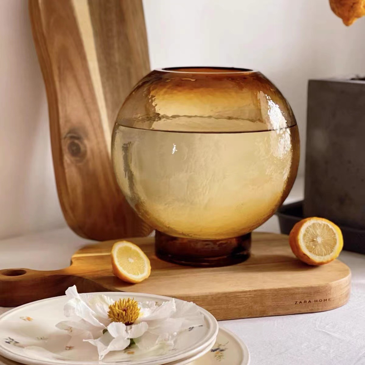シンプルなカラーガラスの視覚ハンマーの丸いボールの琥珀の花瓶の柔らかい装飾の軽い贅沢な水培花器の置物