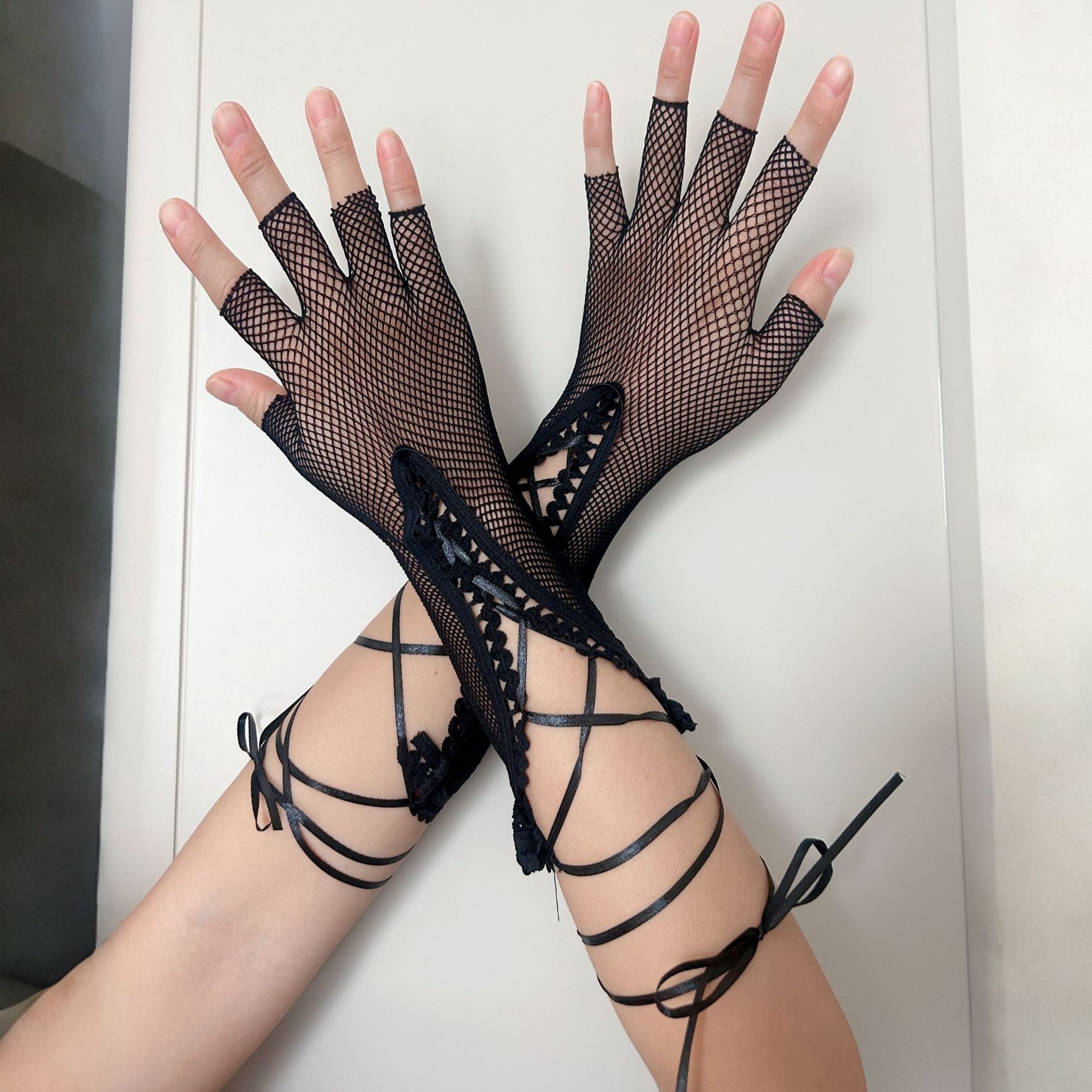 y2k辣妹亚文化jk黑色绑带手袖透气防晒蕾丝手套袖套夜店跨境爆款