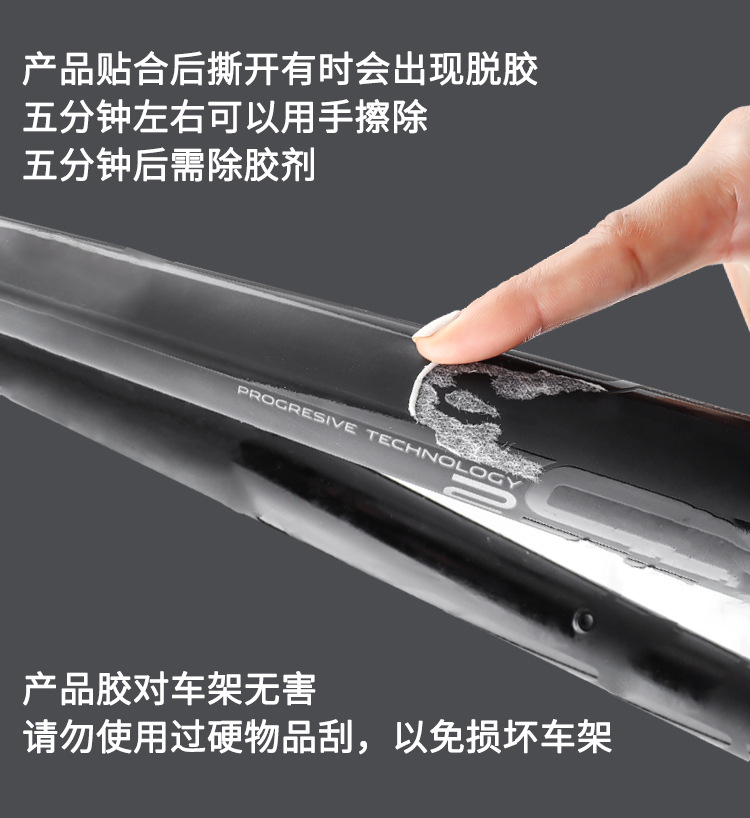 注意:本产品采用进口粘胶,安装前请一定要先确定好位置再安装,如果超过2分钟没有撕下,会导致车架有残胶的产生,从而影响产品的二次利用,如果要清理残胶,请使用除胶剂来配合清理,切不可用硬物去刮车架表面,以免造成车架表面的损伤。