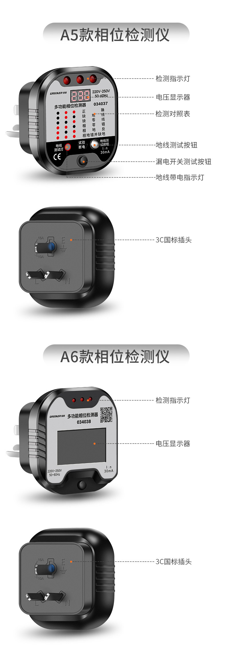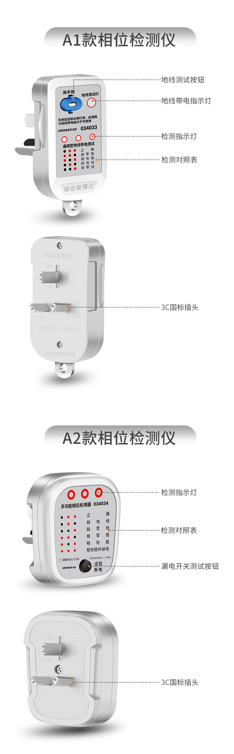 位相検出器多機能コンセント電源極性線路検電器プラグ漏電地線検出