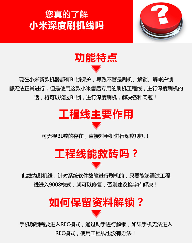 现在小米新款机器都有BL锁保护,导致不管是刷机等都无法正常进行,但是使用这款小米售后专用的原厂线,进行深度刷机的话,将 可以绕过BL锁,进行深度刷机,解决各种问题!