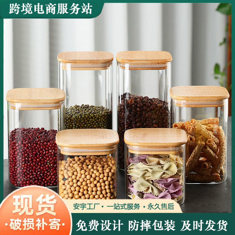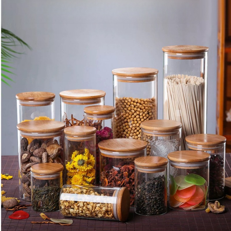 メーカー卸売りストレートガラス竹木蓋花茶葉缶家庭用貯蔵瓶台所雑穀収納瓶