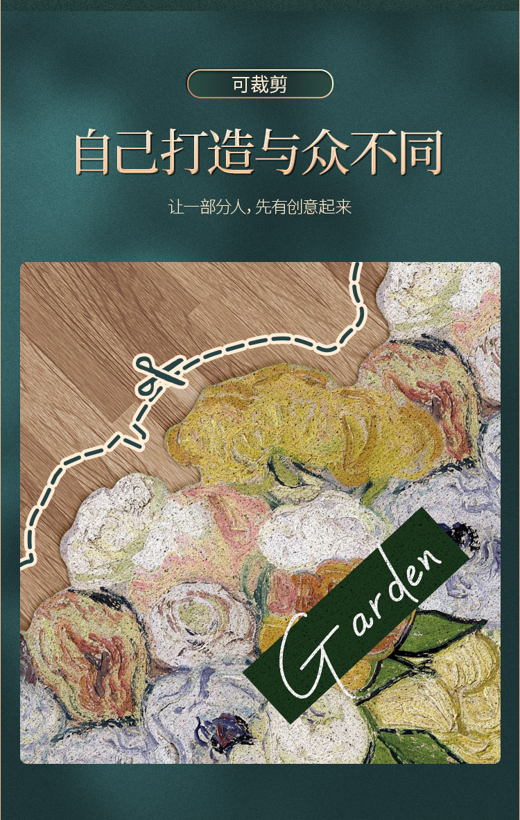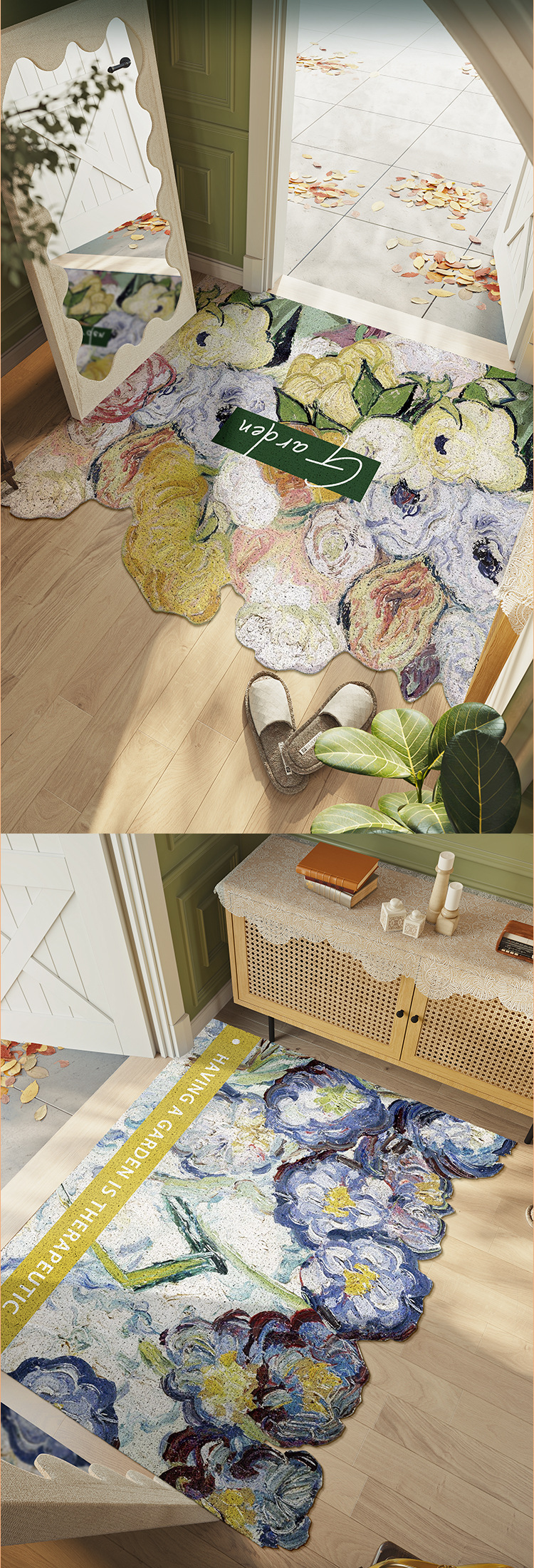 北欧風油絵プリント玄関マット、カット可能PVC滑り止め耐摩耗性玄関マット