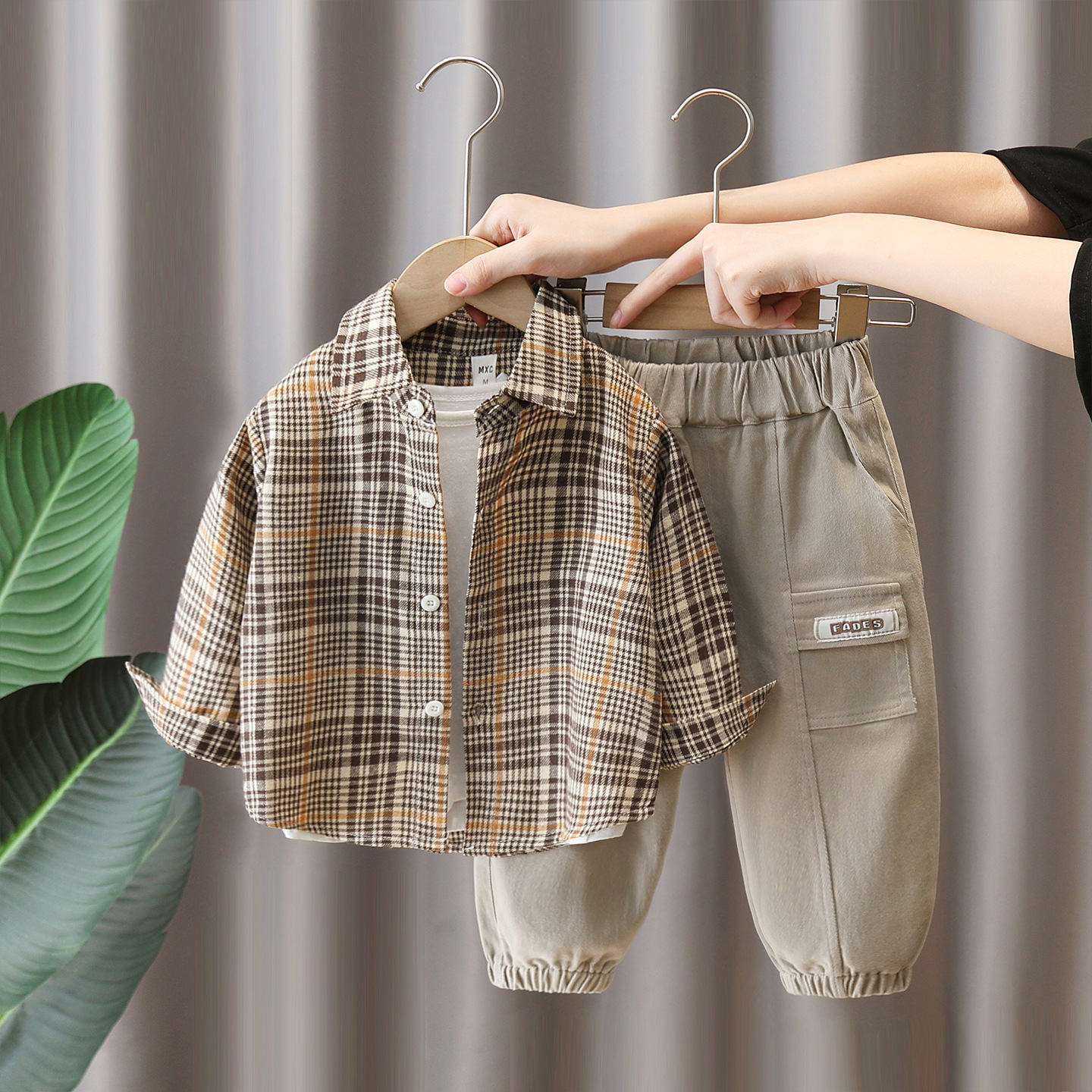 8914男童秋款套装2025新款儿童韩版休闲装春秋季格子衬衫两件套潮