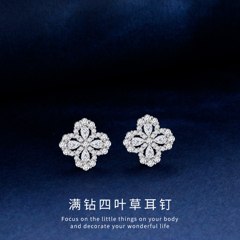 S925纯银璀璨四叶草耳钉女百搭时尚满钻ins风森系耳环高级感耳饰