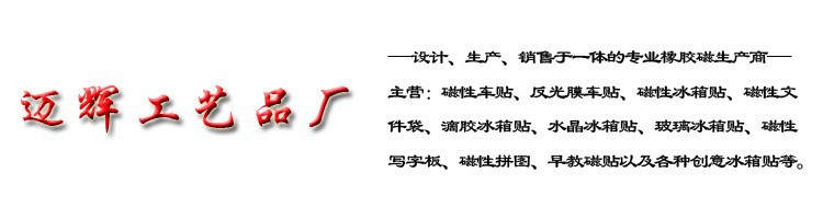 主要制造产品:橡胶磁,橡胶磁条,磁性冰箱贴、磁性相框、磁性写字板水晶滴胶系列产品、磁性马口铁冰箱贴、磁性礼品、磁性文具、玻璃磁扣、玻璃冰箱贴、磁性胶带、磁性打印纸、、磁性初学者标志、实习标志、磁性车贴、磁性书签、磁性材料、彩色磁片、磁扣、橡胶磁(最薄可做到0.15MM,最宽可以做到1020MM,表面可以裱合各种颜色)、钕铁硼、日本广告礼品、日本百元店商品专供,和日本很多卖场礼品商都建立了比较好的合作关系。产品美观,新颖!是各企业促销,广告,送礼等活动之理想选择,欢迎随时咨询及订购.我们热诚期待着各界新老客户的长期友好合作!!
