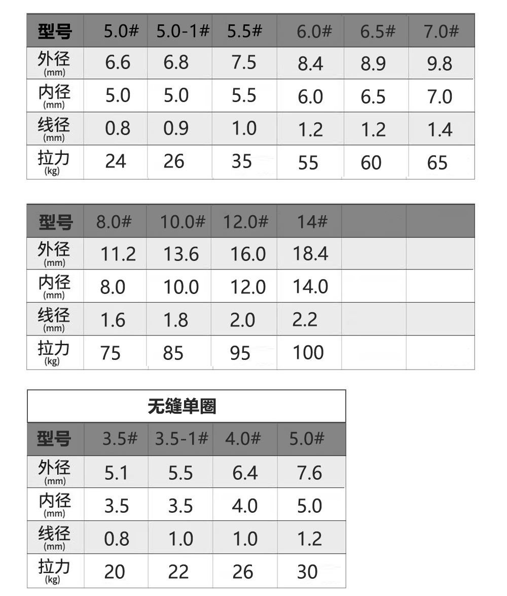 4#二重リング 0.4*4 微小リング,2.5#平型二重リング0.5×内径2.5,3.0#平型二重リング0.6×内径3.0,3.6#平型二重リング0.6×内径3.6,4.0#平型二重リング0.7×内径4.0,4.5#平型二重リング0.7×内径4.5,4.5-1#平型二重リング0.8×内径4.5,5.0#平型二重リング0.8×内径5.0,5.0-1#平型二重リング0.9×内径5.0,5.5#平型二重リング 1.0×内径5.5,6.0#平型二重リング 内径1.2×6.0,6.5#平型二重リング 内径1.2×外径6.5 外径8.9,7.0#平型二重リング 内径1.4×7.0,8.0#平型二重丸 1.6×8.0(外径12),10.0#平型二重リング1.8×内径10(外径14),12.0#平型二重丸 2.0×12(外径16),14.0#平型二重リング2.2×内径14(外径18),3.5#シームレス単円0.8×内径3.5,3.5-1#シームレス単円 1.0×内径3.5 外径5.5,4.0 # シームレス単円 1.0×内径4 外径6.4,5.0#シームレス単円 1.2×内径5 外径7.6