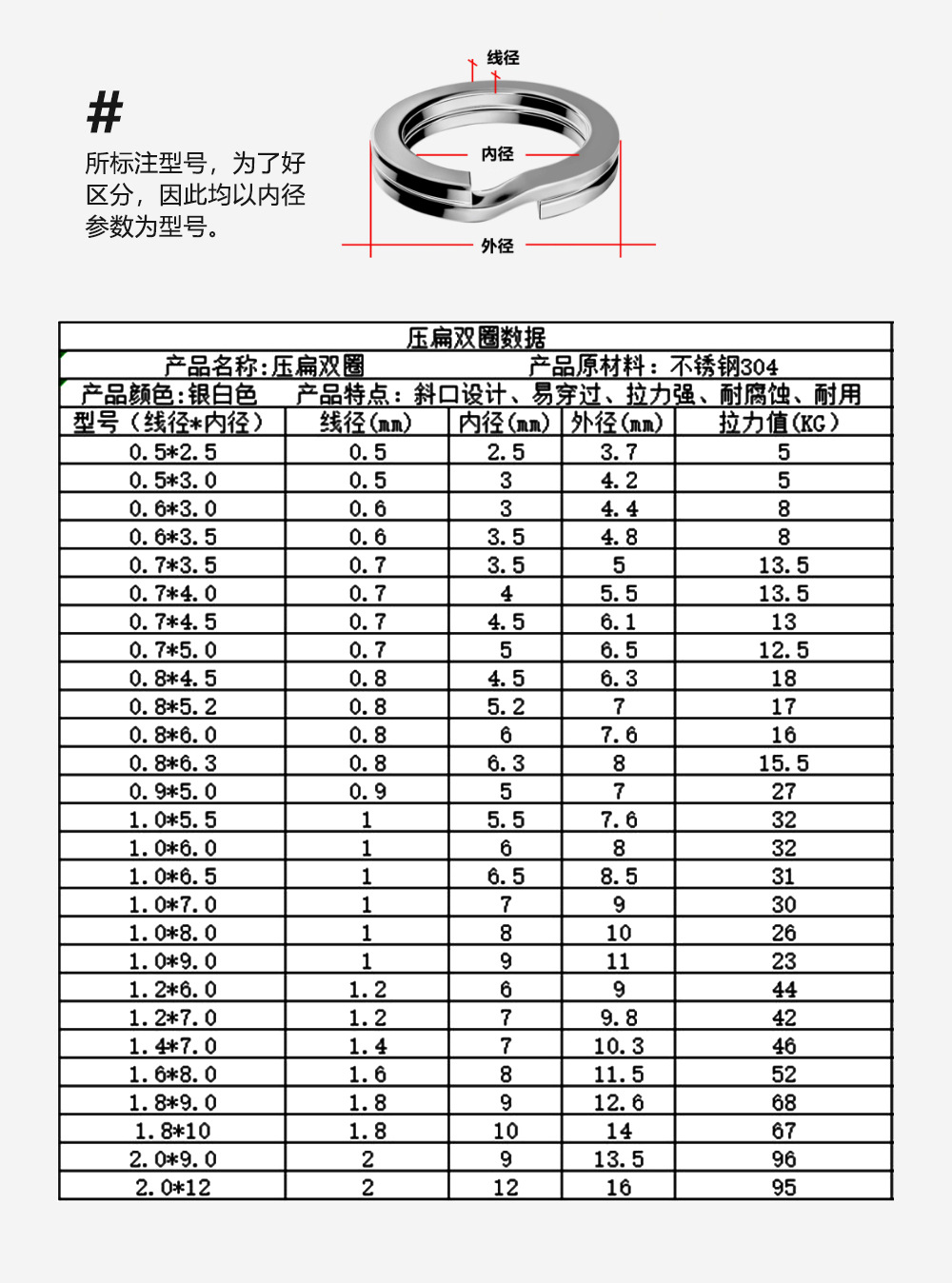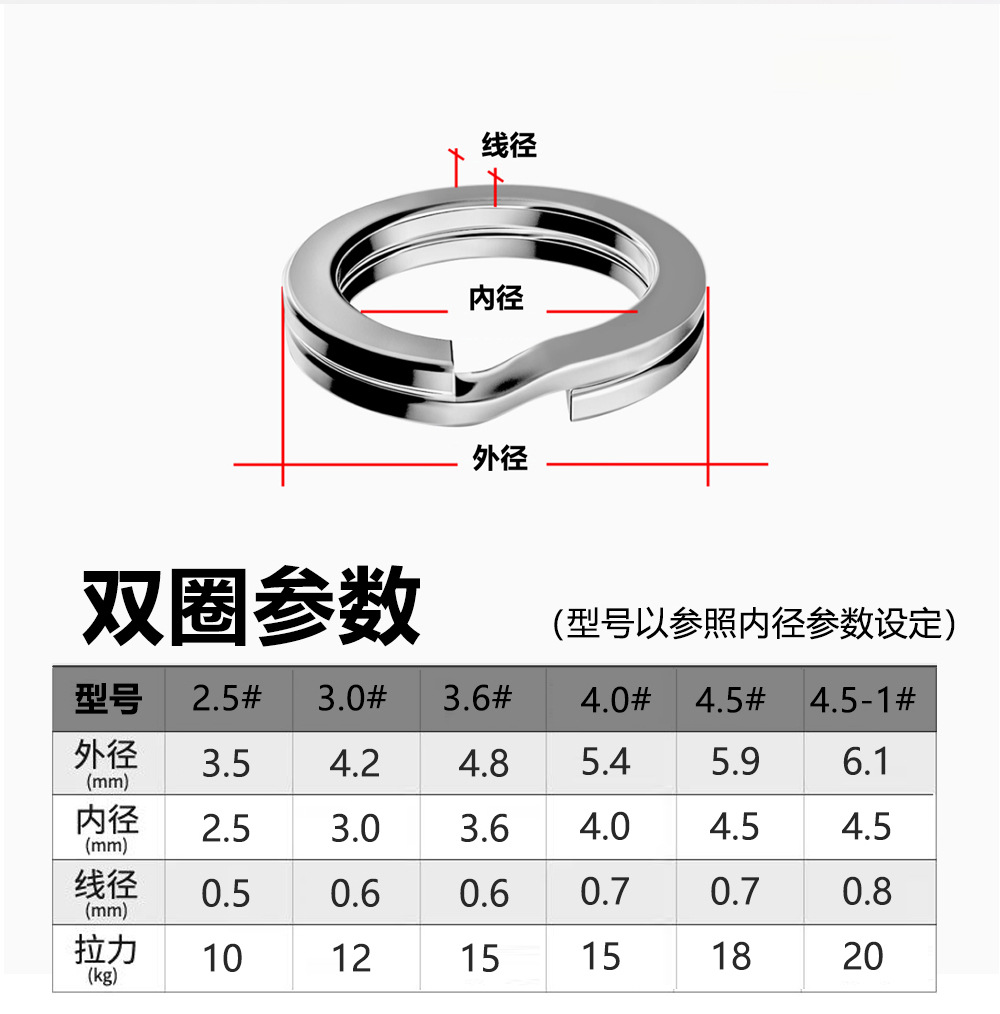304ステンレス鋼製強化型 フラットダブルリング/シングルリング ルアーコネクティングスチールリング 内径はモデルA82です