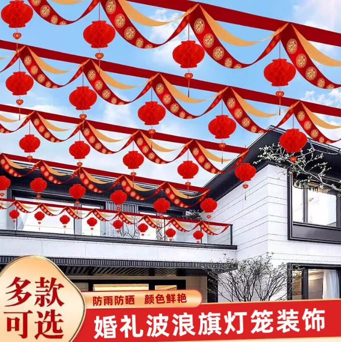 結婚式の色とりどりの旗の透かし彫りの喜字の旗の三角は旗をつるして開業します。