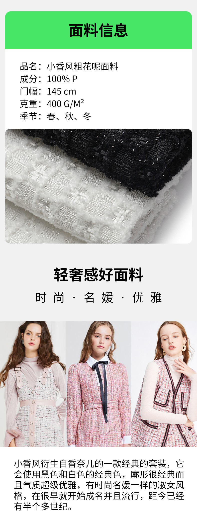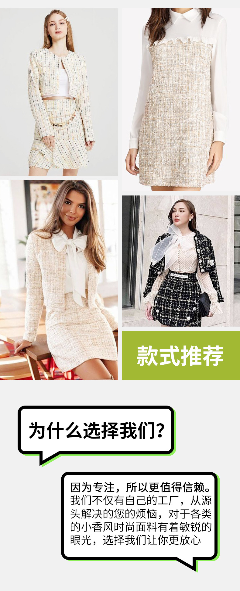 工場直送の小香風生地、粗織りツイード、刺繍、ビーズ、スパンコール、格子柄、花柄、紡績物、卸売、粗織りウール