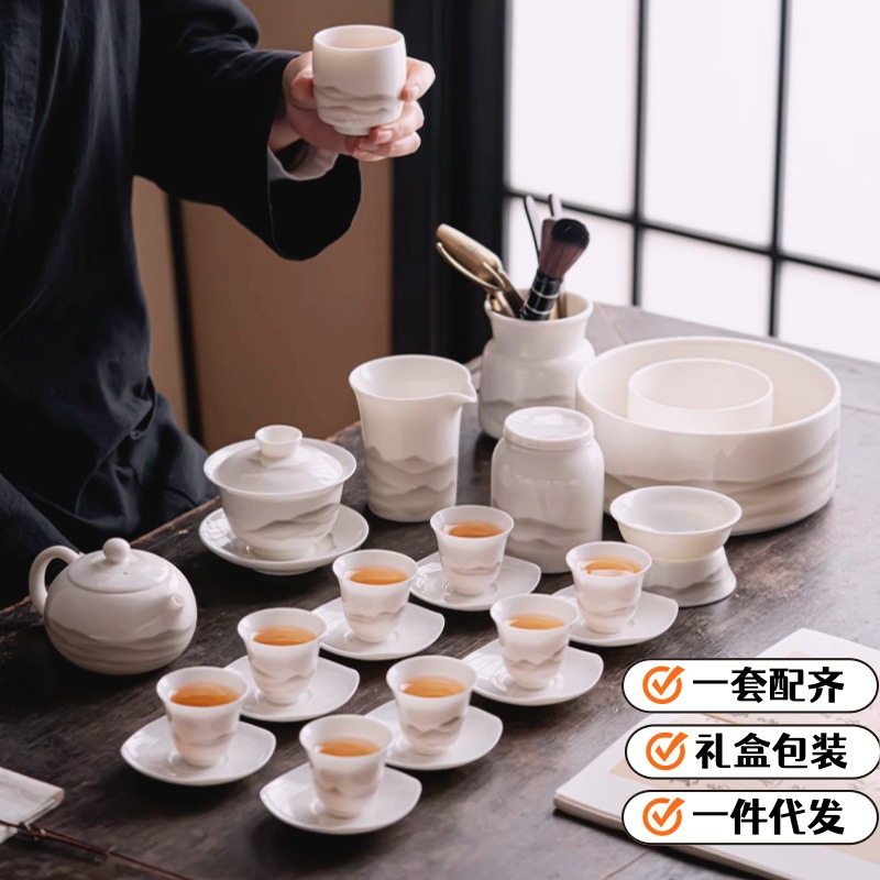 羊脂玉白磁器高級万里江山カンフー茶器セット家庭用蓋碗ティーポット茶杯陶磁器ギフトボックス
