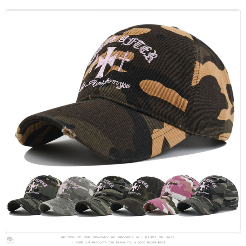 跨境时尚十字刺绣破洞迷彩棒球帽女百搭显脸小鸭舌帽户外登山帽子
