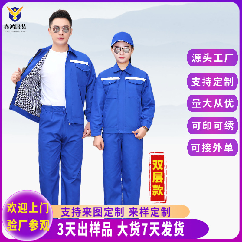 春秋用二重純綿長袖作業服セット 男女兼用 溶接工向け 厚手 反射ストリップ付き 労働保護服 工場制服 カスタムメイド