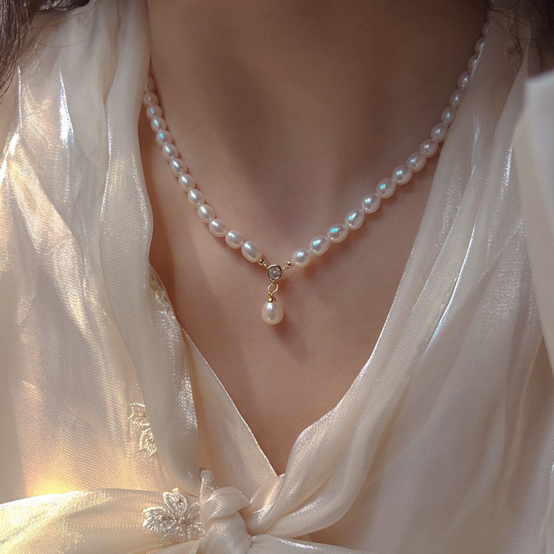天然淡水パールネックレス、強い光、米粒、レトロ、多用途、高級、鎖骨チェーン、明るく絶妙な