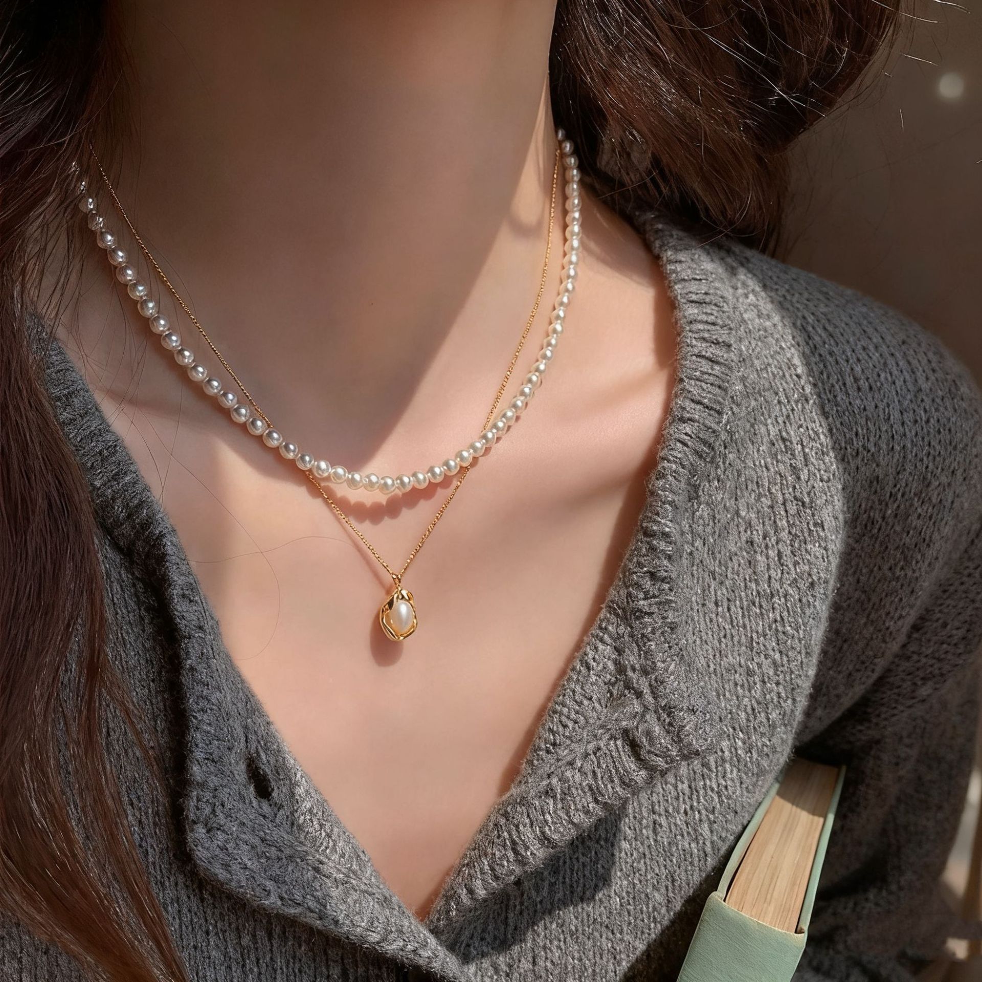 二層積み重ねガラスパールネックレス、ファッショナブルでエレガントなインターネットセレブエンドウ豆淡水パールペンダント、ハイエンドチェーンネックレス