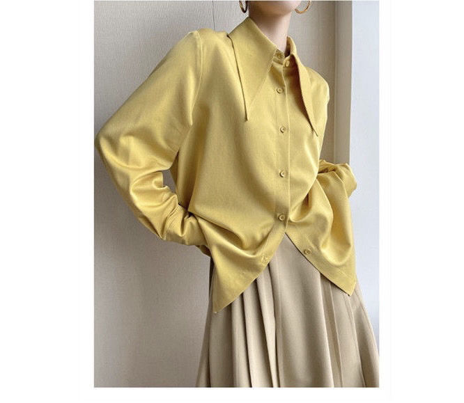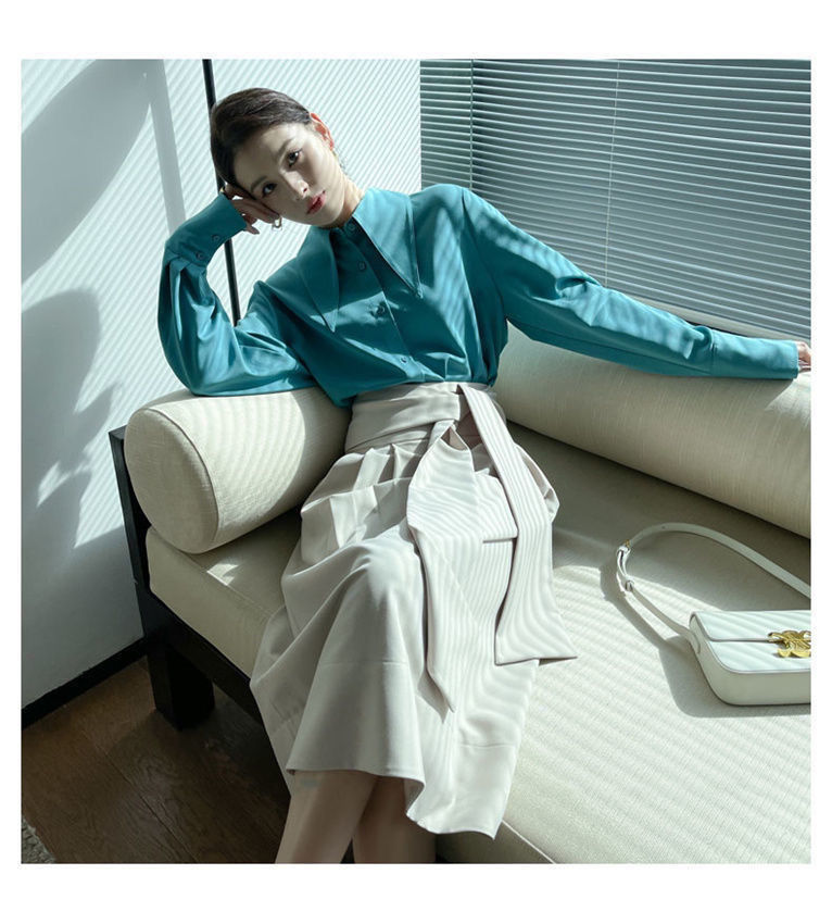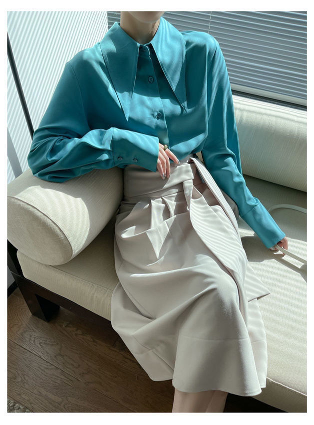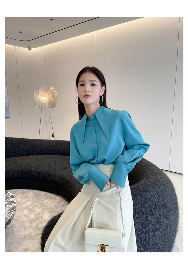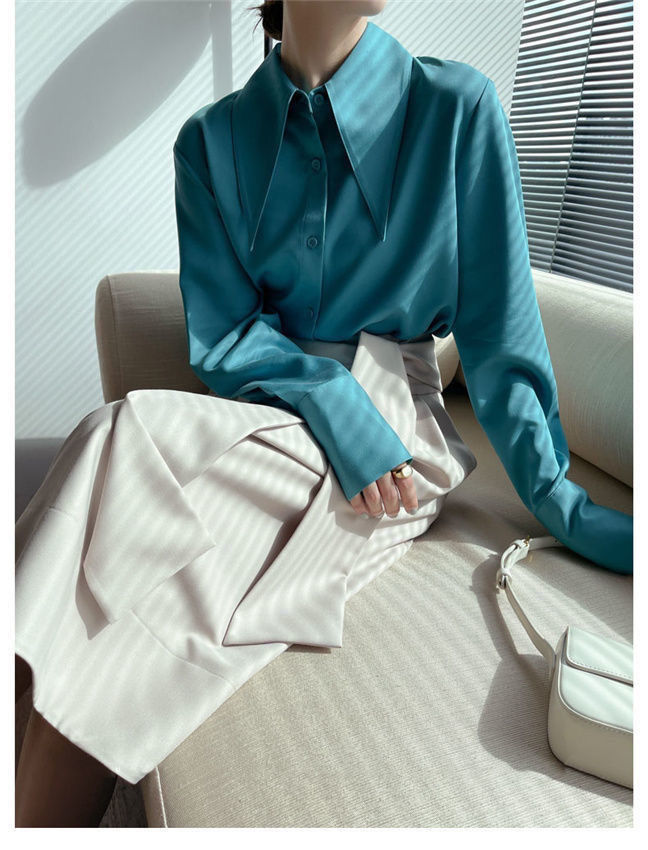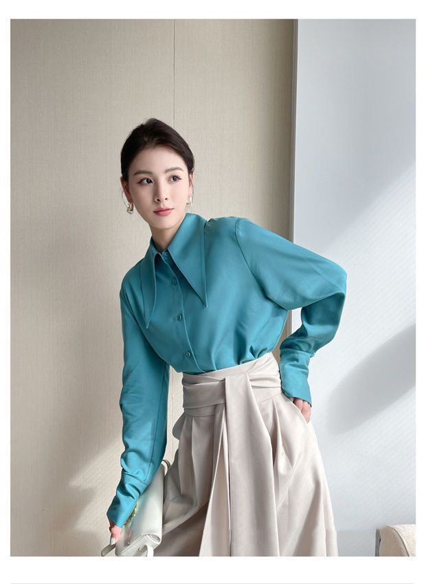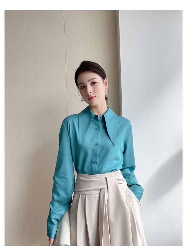 ヘイズブルーの尖襟シャツ レディース 2025 春秋 デザイン性のあるニッチな通勤用オフィスシャツ 酢酸サテン生地トップス