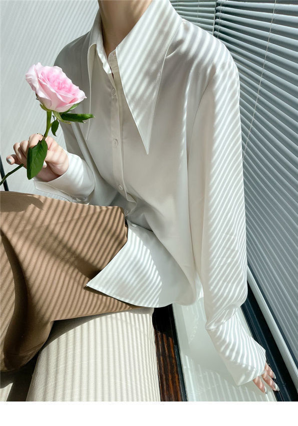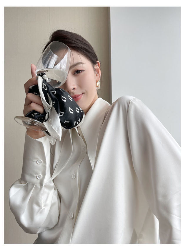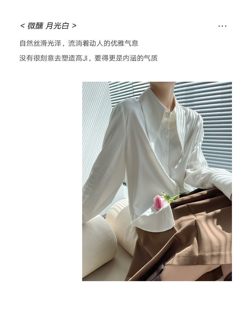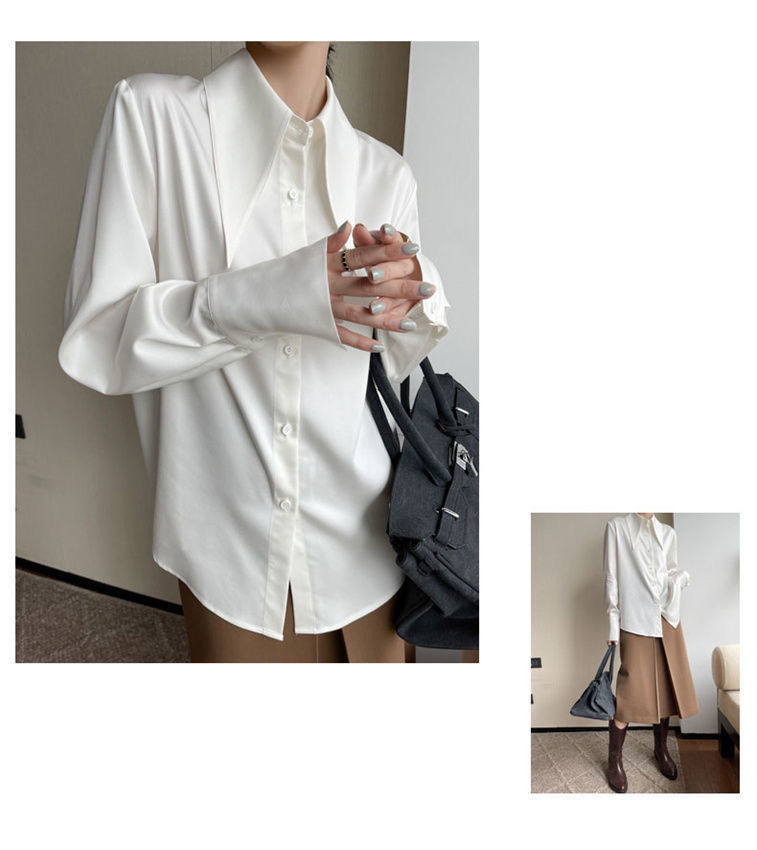 先襟のサテンのシャツの女性2025春秋のゆったりとした垂れ下がった感じのシルクの滑りの上着のデザイン感の小さい大衆の気質の襟のシャツ