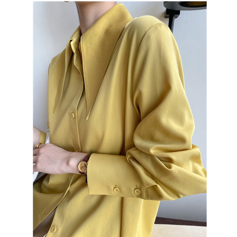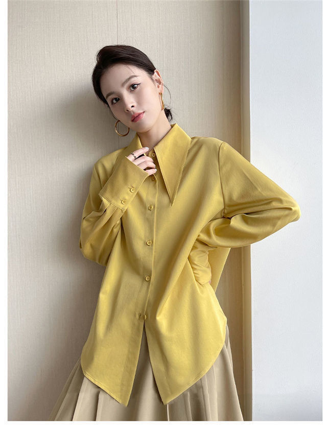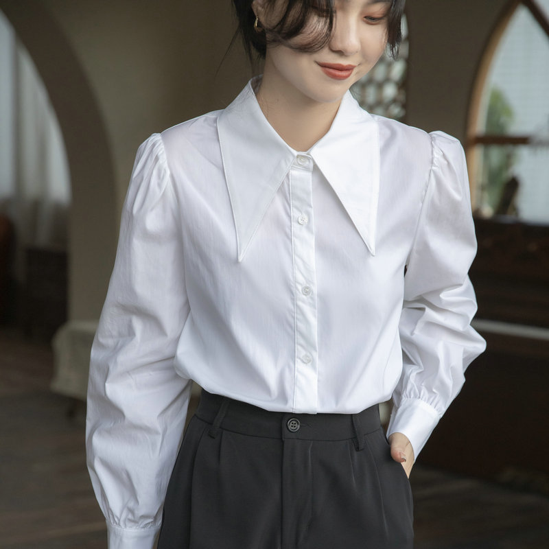 フランス風個性的な尖襟シャツ レディース 2025春秋新作 無地シンプルデザイン パフスリーブシャツ トレンド