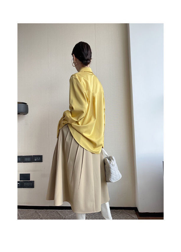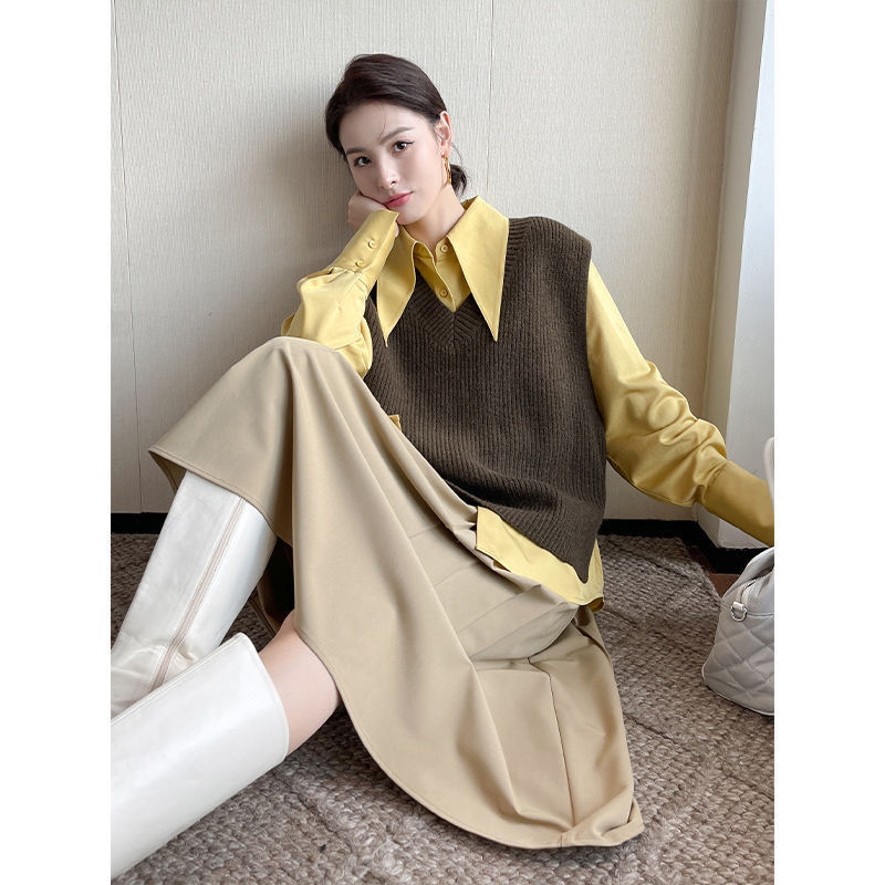 東大門のシャツの先の襟の大きい版のシャツの上着の女性の長袖のゆったりしているつなぎ合わせの中で長いデザイン感の大衆