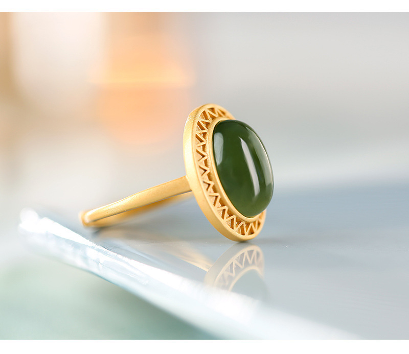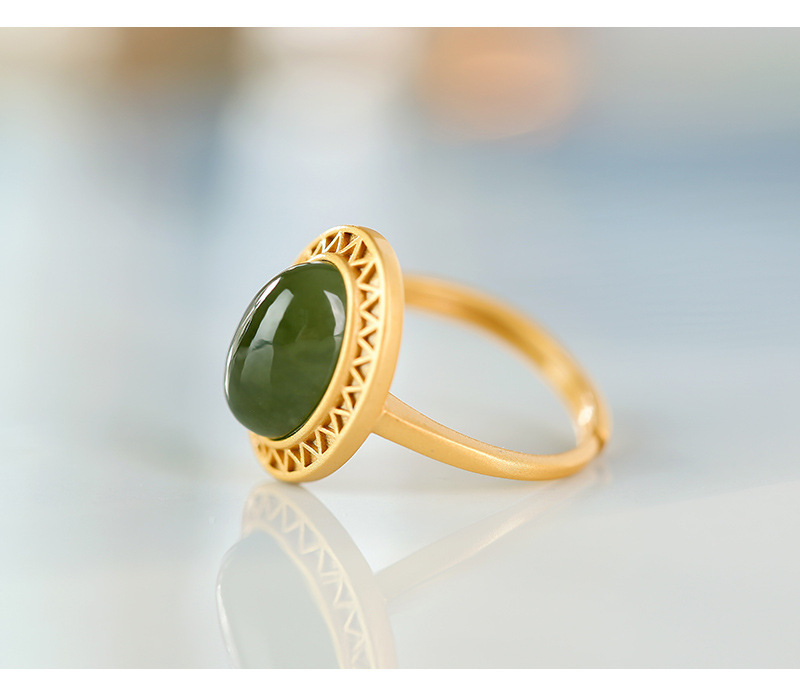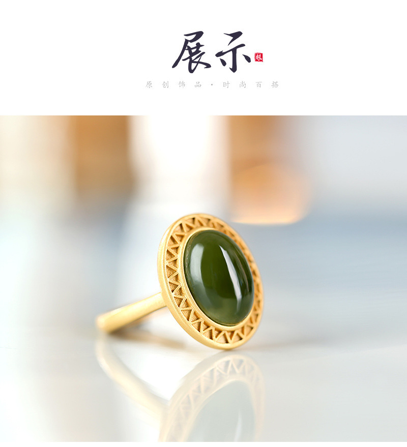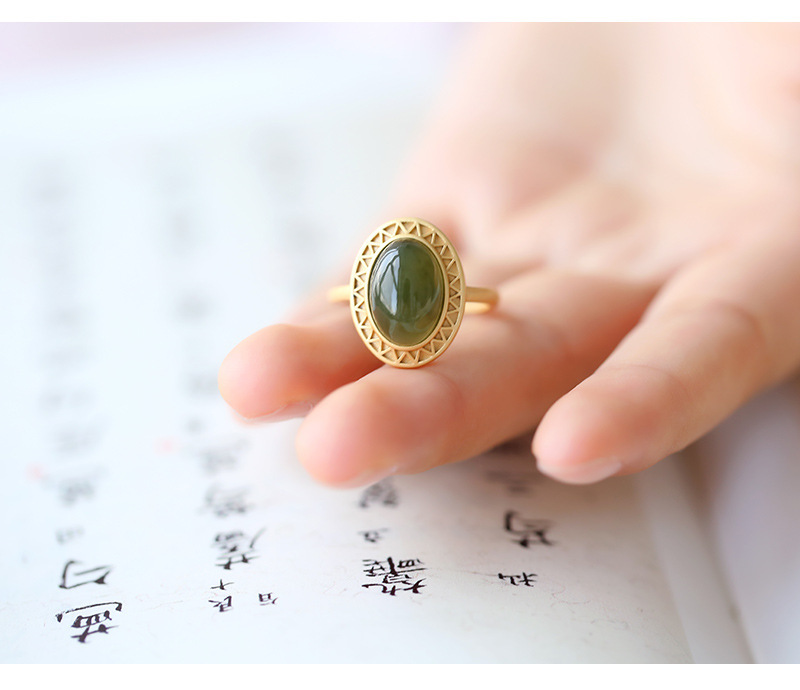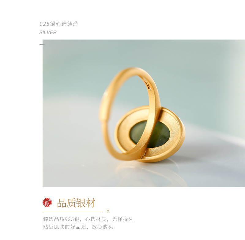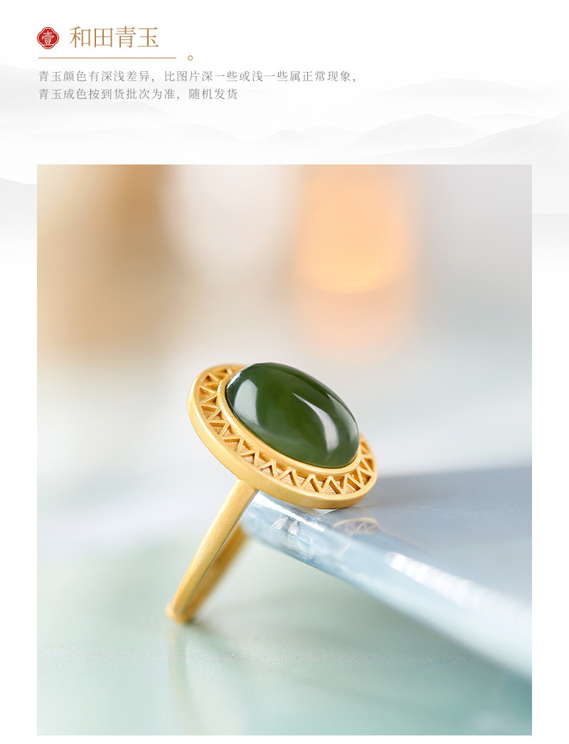青玉天然和田玉緑玉指輪金色日系宮廷風復古開口メッキ925銀指輪女性