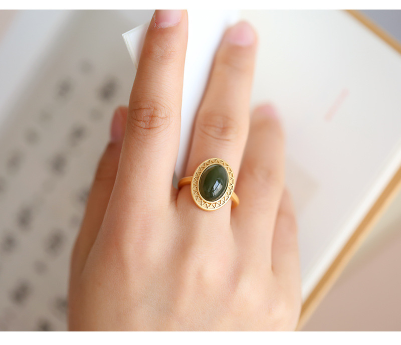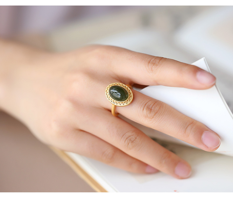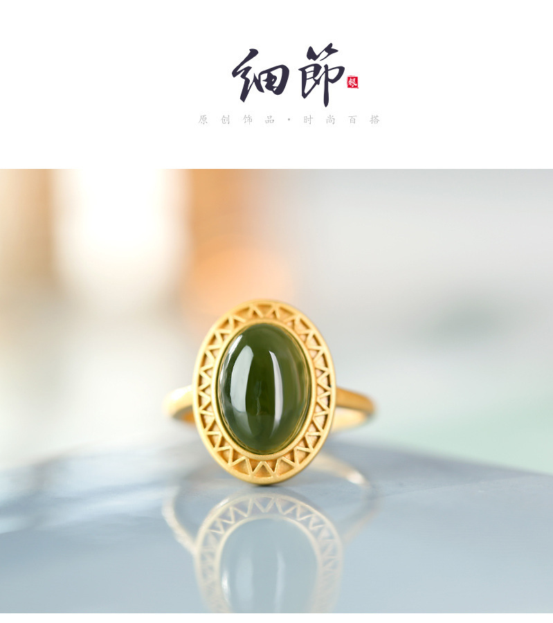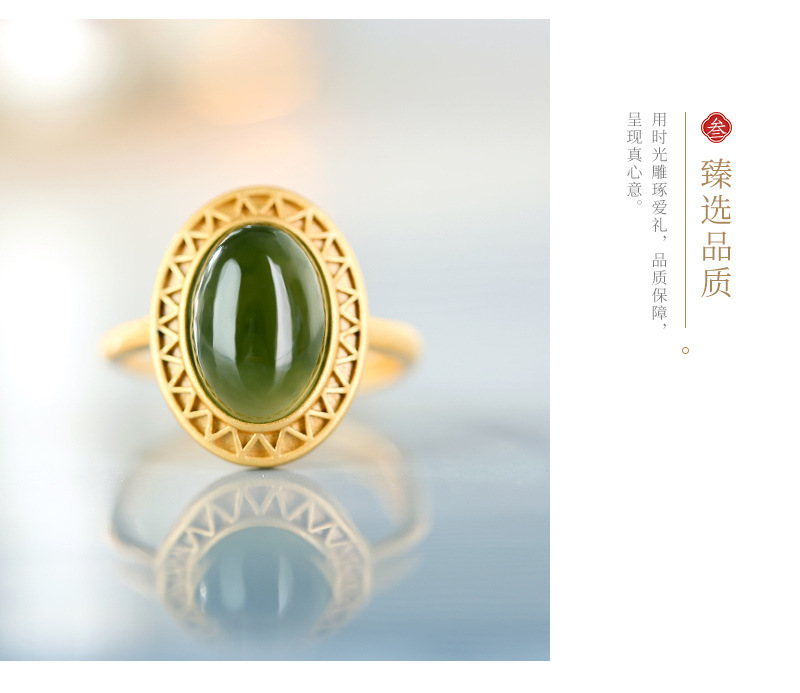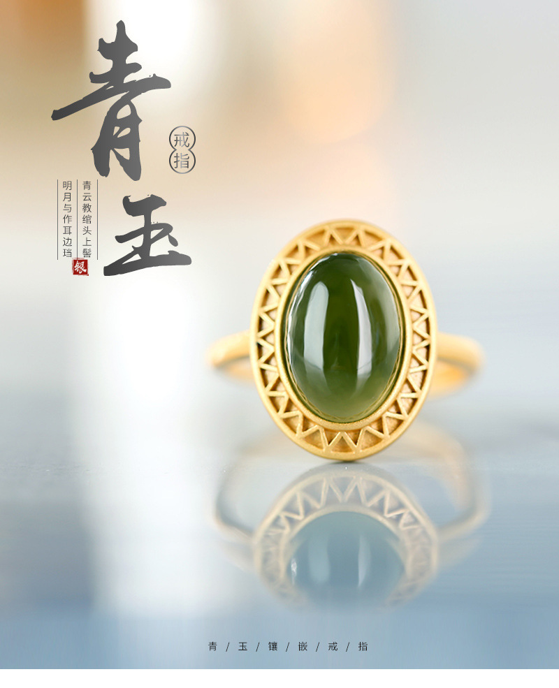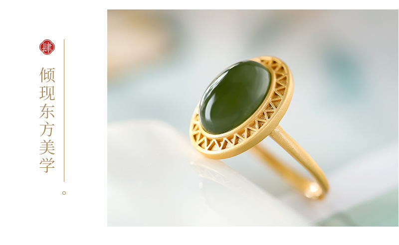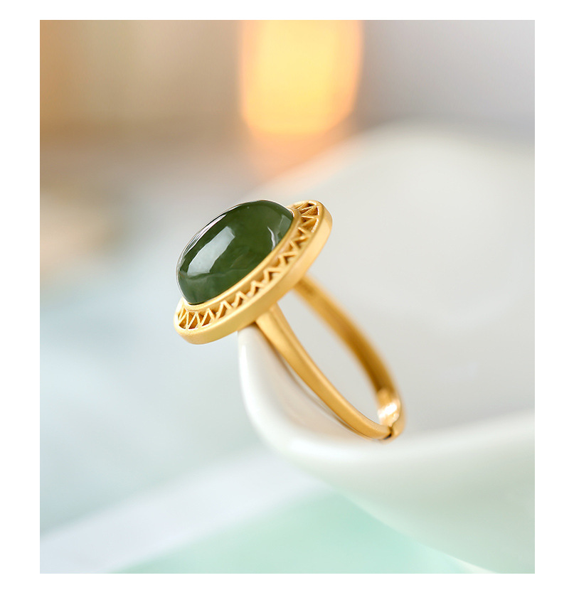 青玉天然和田玉緑玉指輪金色日系宮廷風復古開口メッキ925銀指輪女性