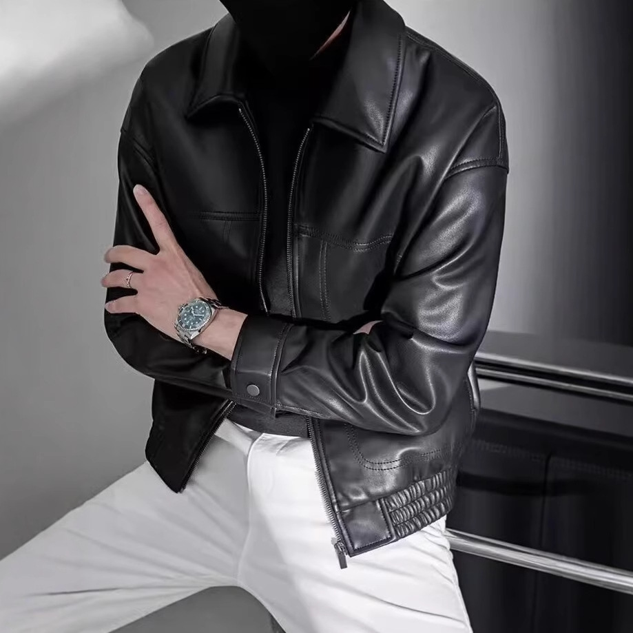 2025秋季青年拉链不连帽直下摆拉链挖袋翻领休闲现货皮夹克