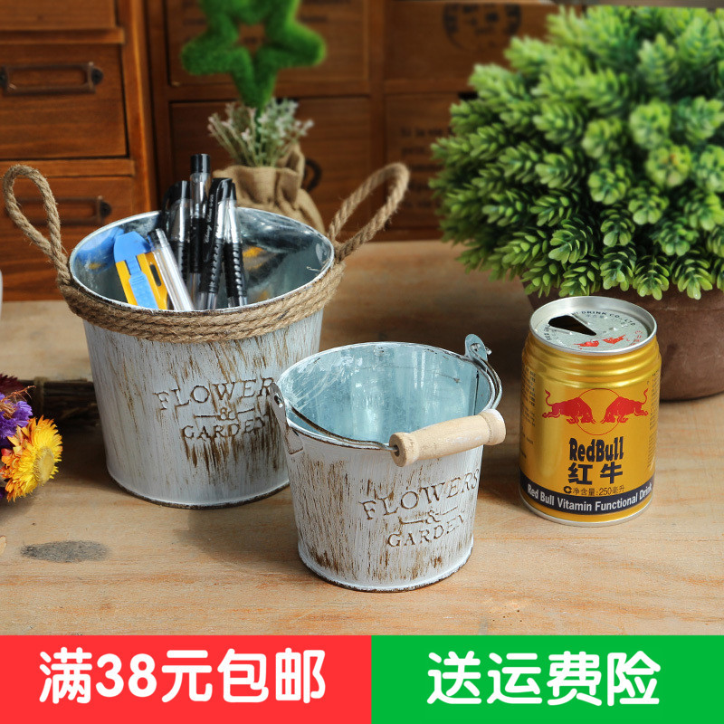鉄芸レトロシンプル鉄桶植木鉢客間装飾ブリキ花桶麻縄持ち手創意鉄皮桶