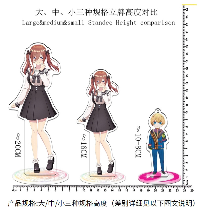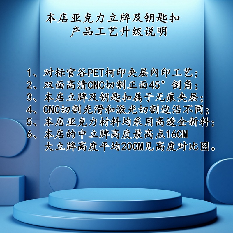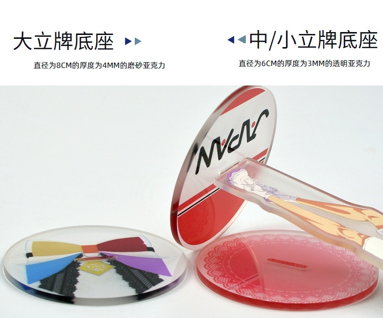 大立牌及中立牌的台座的大小是不一样的,材质也不同,大立牌的底座是用直径为8CM的厚度为4MM的磨砂亚克力,而中立牌为直径为6CM的厚度为3MM的透明亚克力中底座图案也一样;
