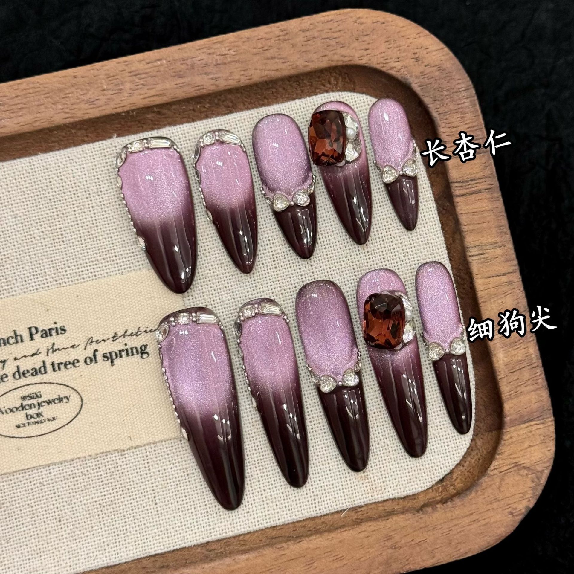 艺禾穿戴甲【月光变奏曲】浪漫梦幻高级紫色猫眼玻璃珠长款美甲贴